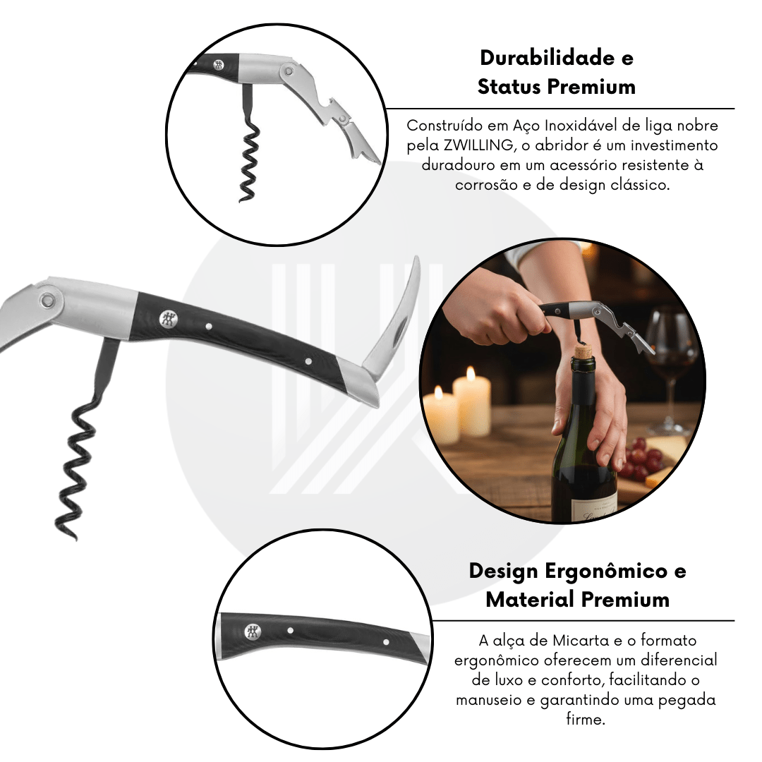 O Abridor Saca-Rolhas ZWILLING Garçom Classica é a ferramenta de alto padrão que transforma o processo de abertura de vinhos em uma experiência simples, elegante e precisa em sua área gourmet. A ZWILLING, uma marca alemã renomada com legado de excelência, oferece um investimento duradouro em acessórios essenciais de sommelier.