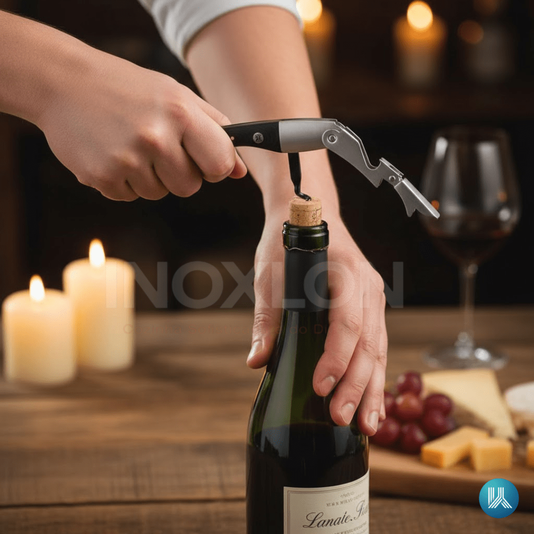 Abertura Sem Esforço e Segura: O eixo forjado com revestimento antiaderente e a alavanca de dois estágios solucionam o problema da rolha presa, garantindo que o processo de tirar a rolha seja uma experiência simples e suave.