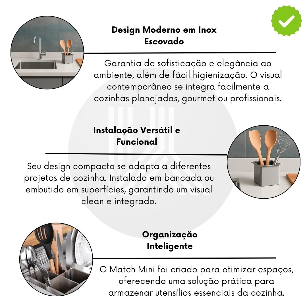 Mais do que um porta utensílios, o produto é um aliado na organização diária. O Match Mini mantém tudo ao alcance das mãos, tornando o preparo das refeições mais prático e rápido.