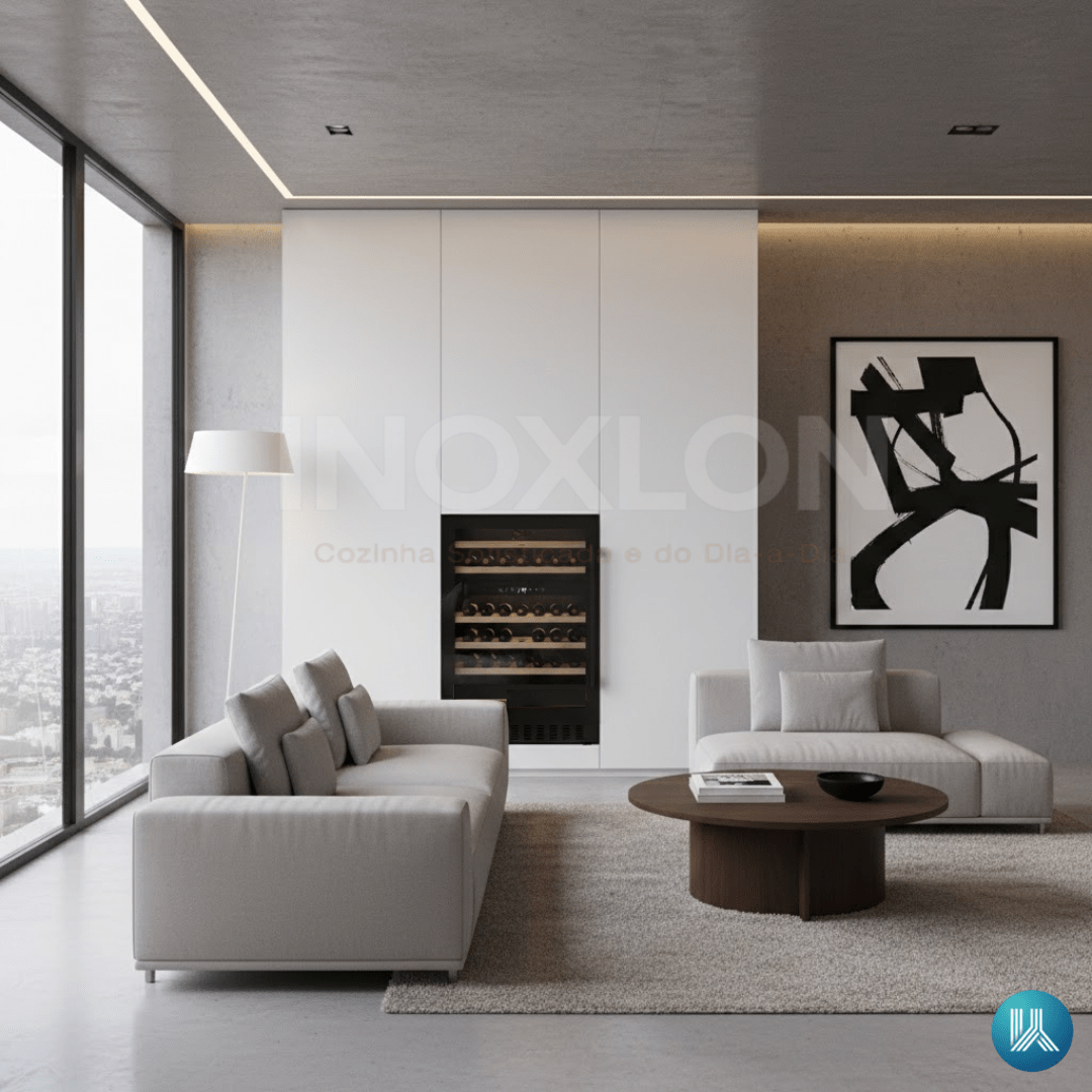 Proteção UV Low-E e Filtro de Carvão: A porta com tecnologia Low-E soluciona a blindagem contra a luz externa, enquanto o filtro de carvão ativado garante um ar interno puro, livre de odores que poderiam comprometer a qualidade da rolha.