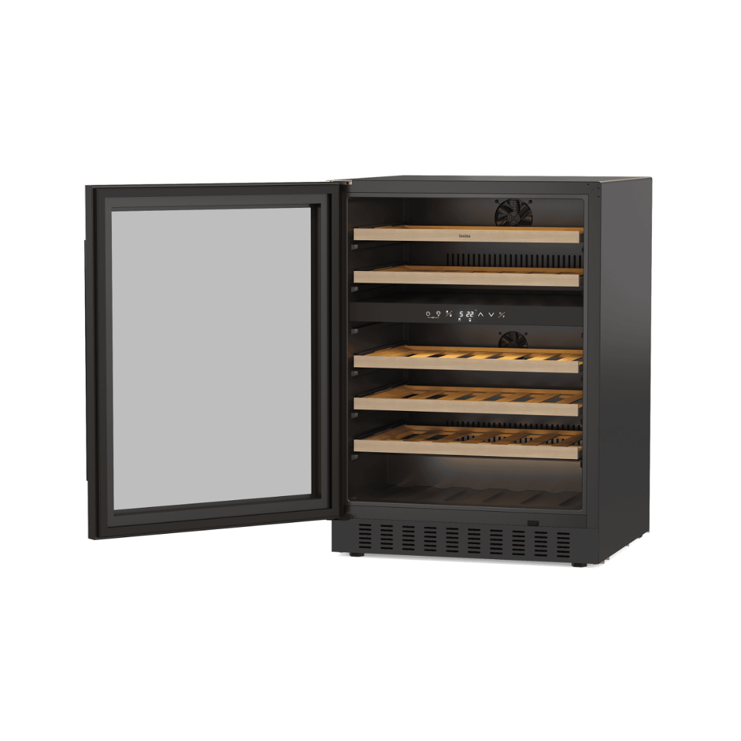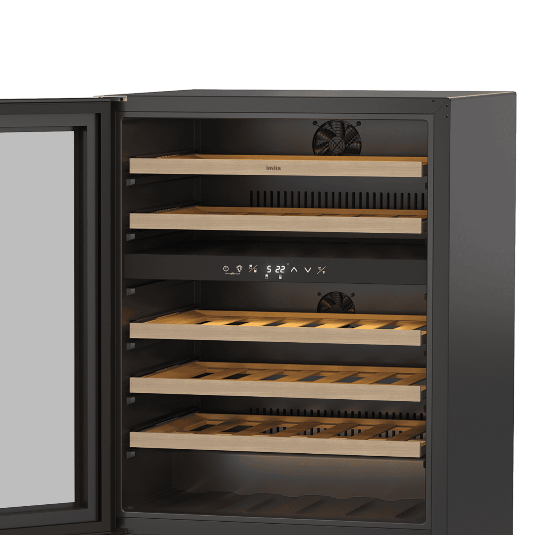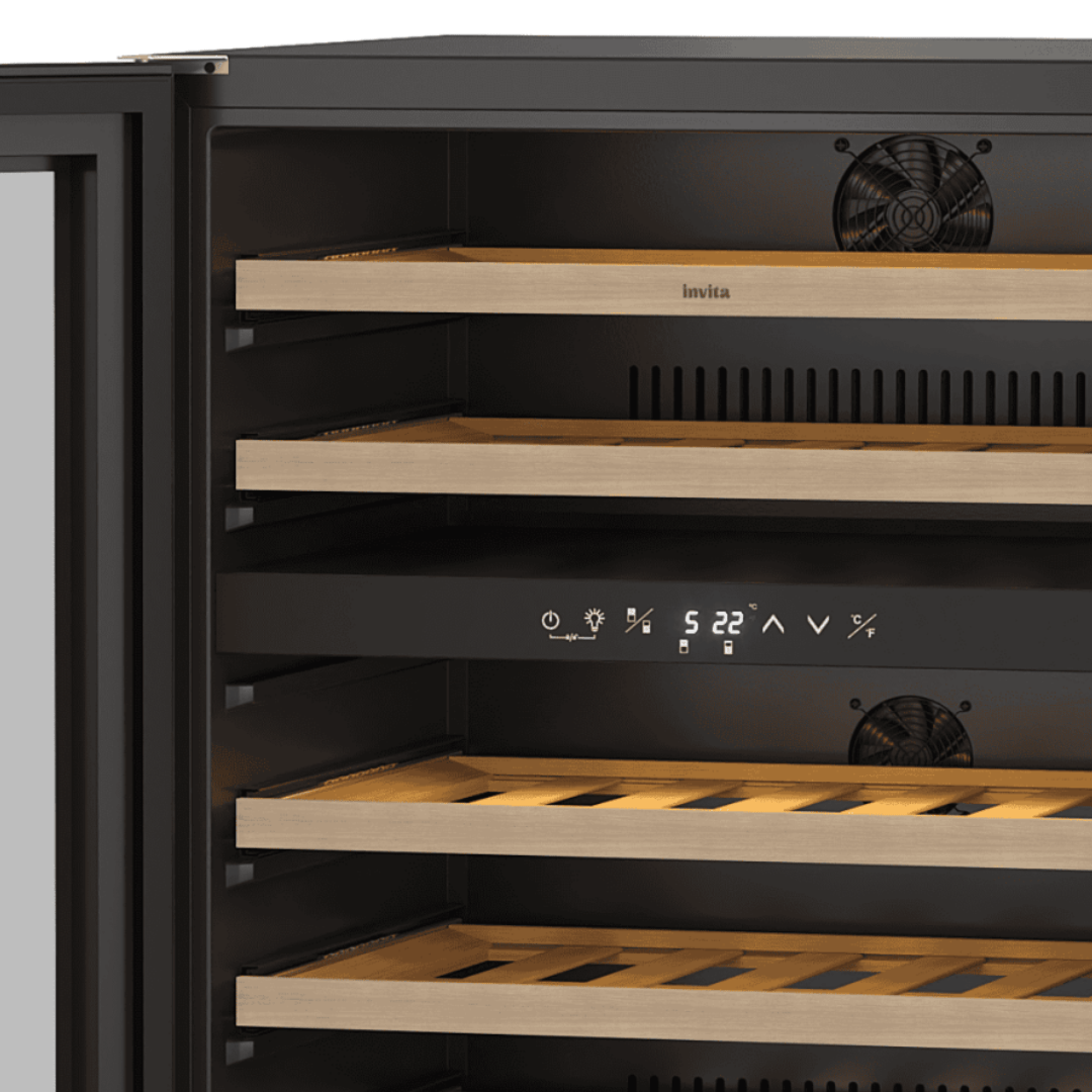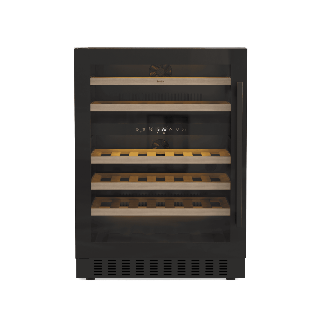 A Adega Invita Black 46 Garrafas Dual Zone é a materialização do luxo para entusiastas do vinho. Projetada para instalação built-in, ela soluciona a necessidade de uma integração contínua à marcenaria, utilizando sua ventilação frontal para permitir um embutimento total e elegante. Com o sistema Dual Zone, você tem o controle independente de dois ambientes, permitindo que espumantes e tintos de guarda convivam no mesmo equipamento entre 5 °C e 22 °C. É um investimento duradouro com acabamento em vidro preto, equipado com Compressor Inverter, que garante estabilidade térmica com silêncio absoluto e baixíssima vibração.