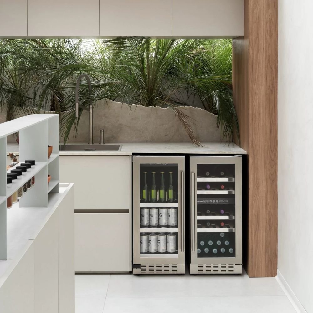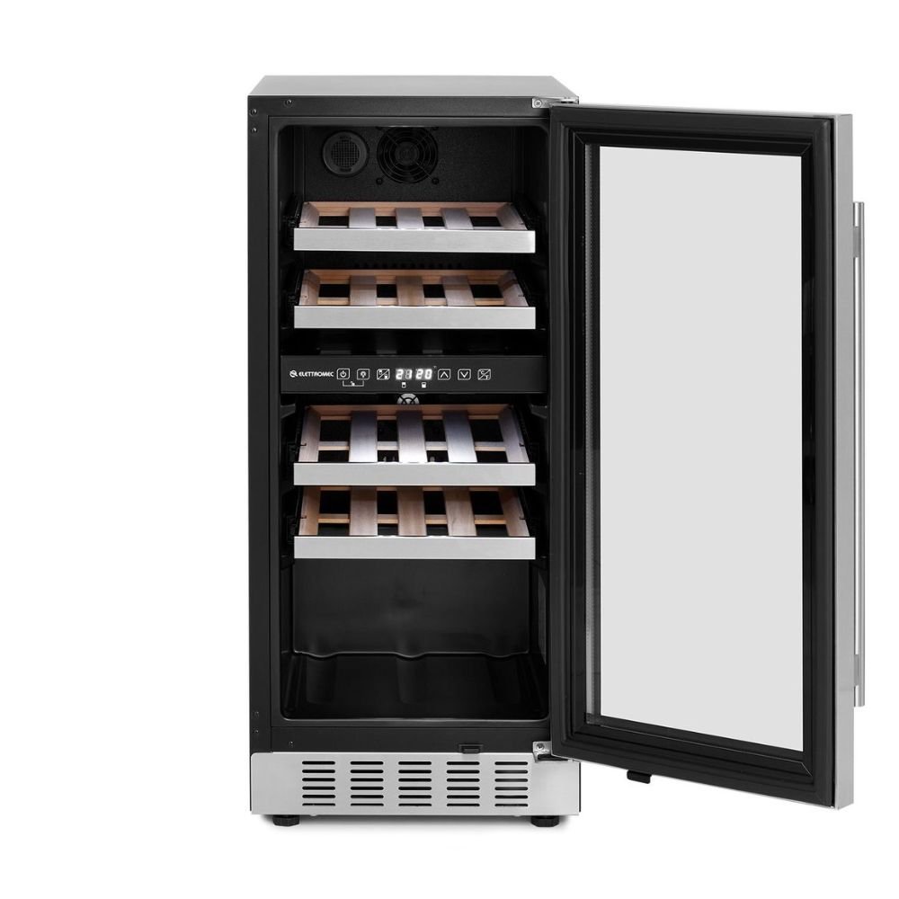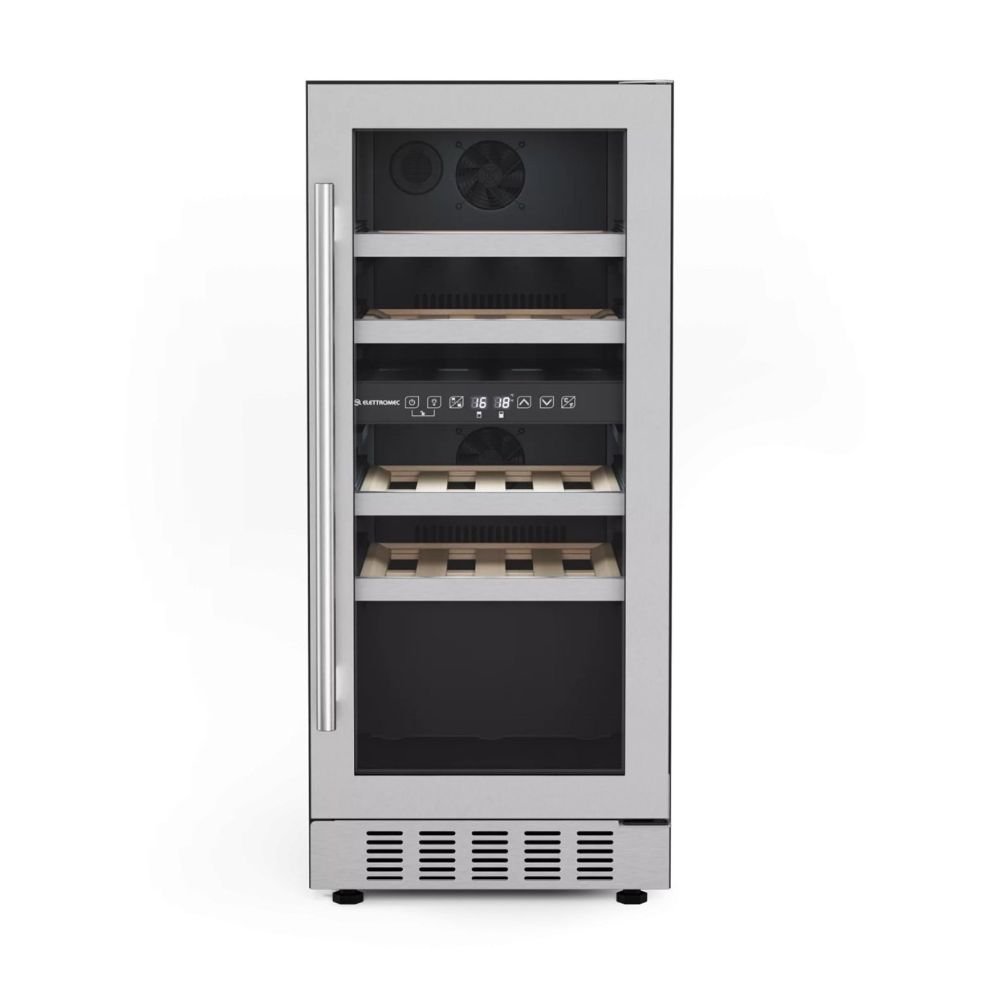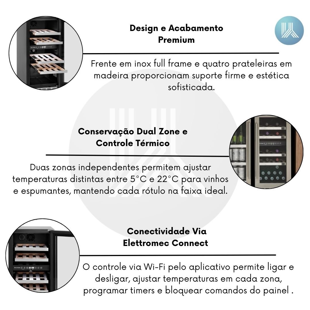 A Adega Dual Zone Built-in Connect de 26 garrafas reúne tecnologia e design para quem exige controle preciso do armazenamento de vinhos. Compacta para embutir, conta com duas zonas independentes, conexão Wi-Fi via aplicativo Elettromec Connect e acabamento inox que valoriza projetos sob medida, oferecendo conveniência, iluminação que não altera a bebida e prateleiras que protegem rótulos.