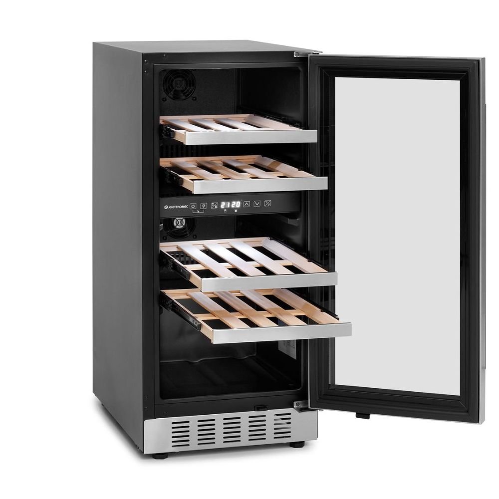 Frente em inox full frame e quatro prateleiras em madeira proporcionam suporte firme e estética sofisticada, enquanto as corrediças telescópicas 100% asseguram deslizamento suave e segurança ao puxar. As prateleiras amortecem vibrações e preservam os rótulos, e o vidro temperado com película Low-E minimiza a penetração de raios infravermelhos, protegendo a qualidade do vinho e valorizando projetos embutidos.