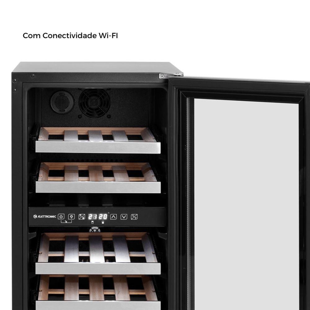 O controle via Wi-Fi pelo aplicativo Elettromec Connect permite ligar e desligar a adega, ajustar temperaturas em cada zona, programar timers e bloquear comandos do painel local. A integração com assistentes de voz e sistemas de Smart Home amplia a automação, enquanto notificações no celular informam alterações e alarmes, fornecendo monitoramento contínuo e maior conveniência para colecionadores e ambientes comerciais.