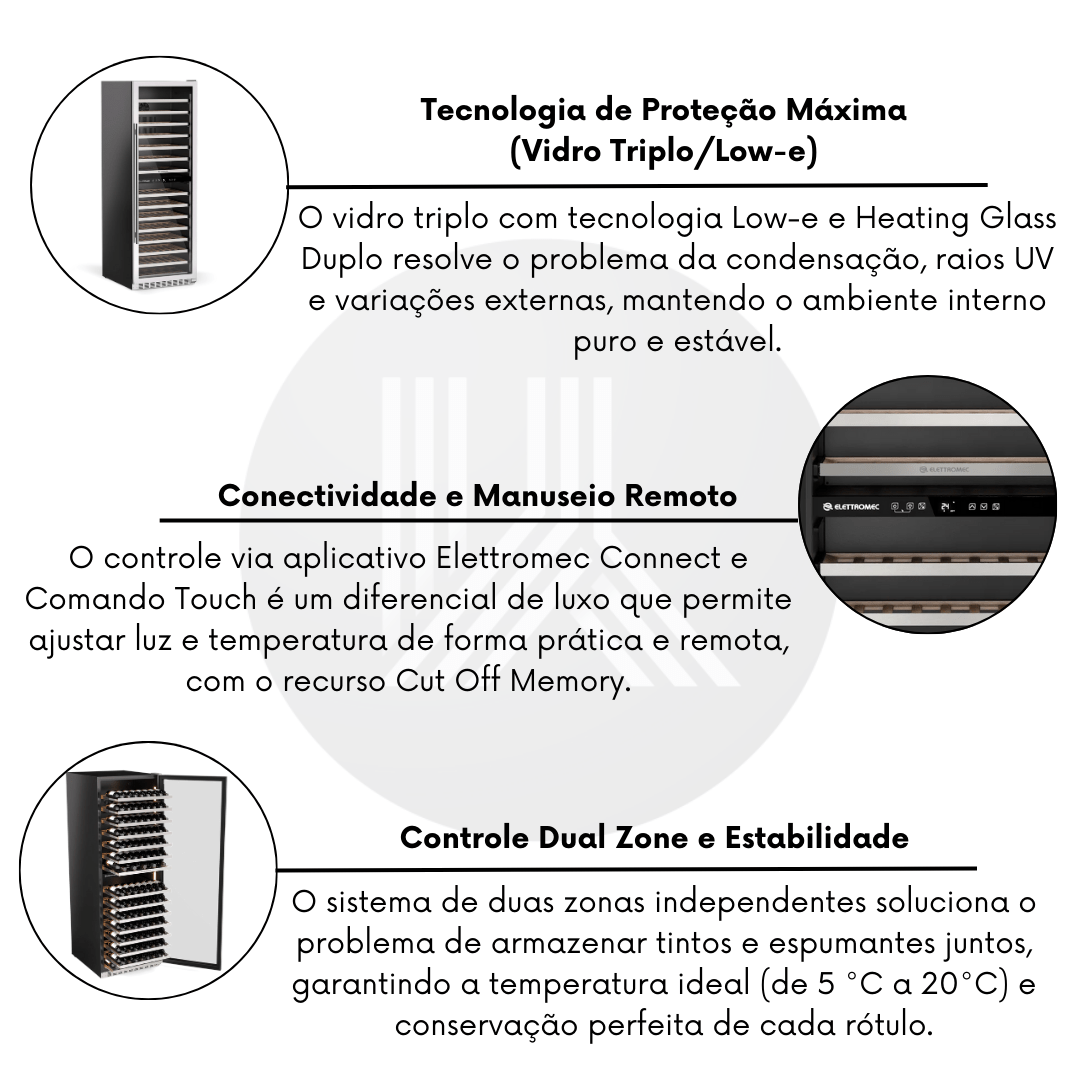 Tecnologia de Conservação e Conectividade Premium: O sistema Dual Zone permite armazenar diferentes tipos de vinhos em duas zonas de temperatura independentes (5 °C a 20 °C), solucionando o problema da conservação mista. O comando touch com display LED e a conectividade via aplicativo permitem ajustar luz, temperatura e umidade de forma prática e remota. A tecnologia Cut Off Memory resolve a dificuldade de quedas de energia, retomando automaticamente a última configuração para manter a estabilidade.