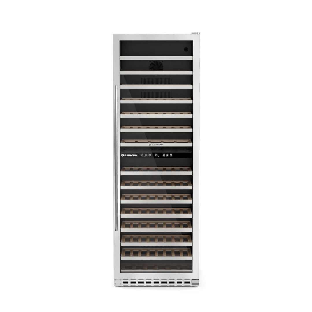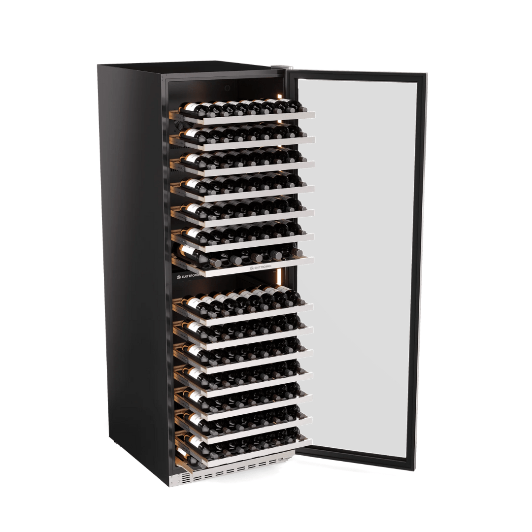 O design imponente é marcado pelo acabamento Inox 304 Full Frame, que garante elegância, durabilidade e resistência. As prateleiras com frente em inox e as corrediças telescópicas facilitam o acesso, enquanto a porta com trava oferece um diferencial crucial de segurança para seus rótulos mais valiosos. A LED Strip lateral ilumina uniformemente, destacando os rótulos sem comprometer a conservação.