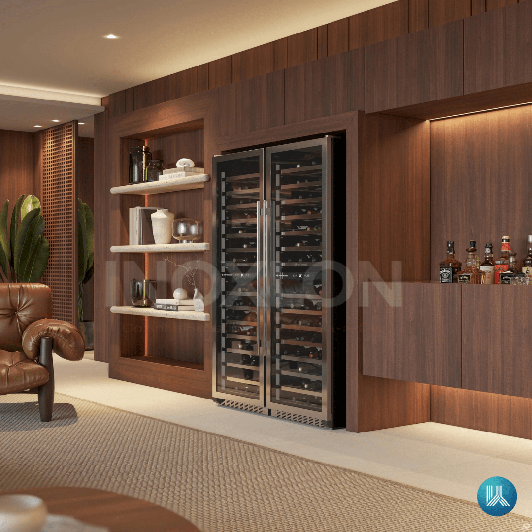 Proteção Máxima (Vidro Triplo/Low-e): O vidro triplo com tecnologia Low-e e Heating Glass Duplo resolve o problema da condensação, raios UV e variações externas, mantendo a estabilidade crucial para o vinho.