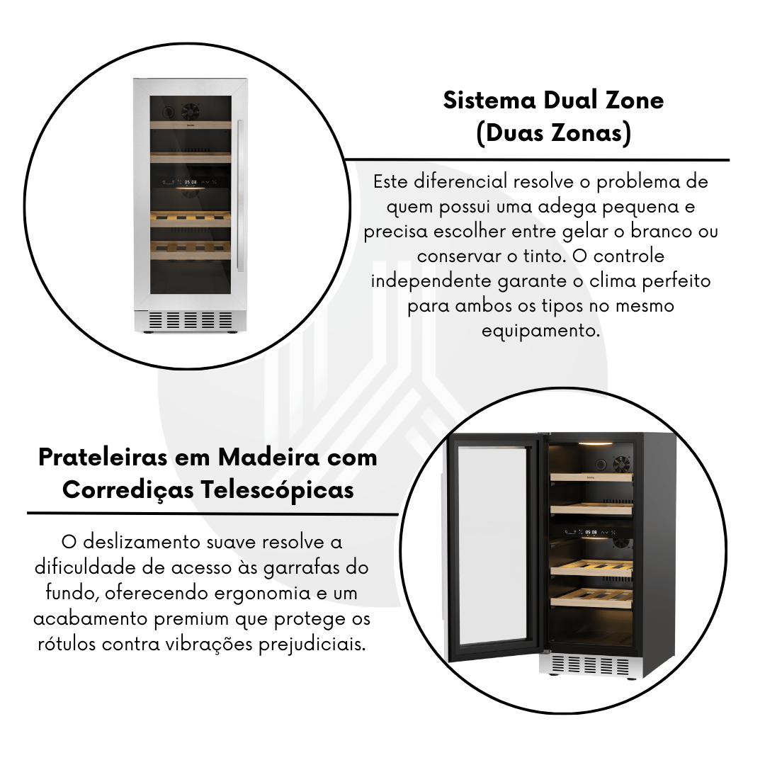 Sistema Dual Zone (Duas Zonas): Este diferencial resolve o problema de quem possui uma adega pequena e precisa escolher entre gelar o branco ou conservar o tinto. O controle independente garante o clima perfeito para ambos os tipos no mesmo equipamento.