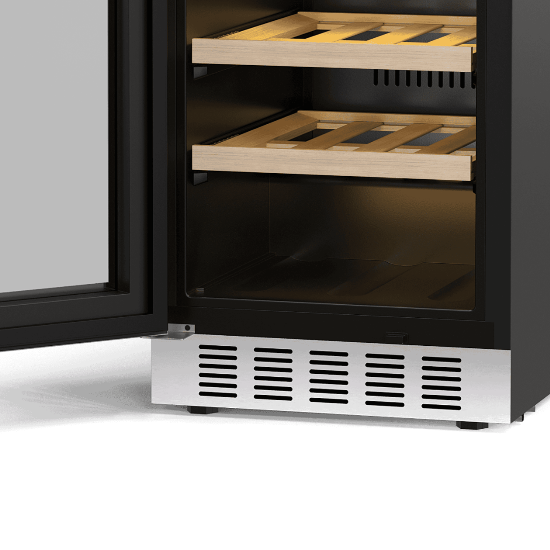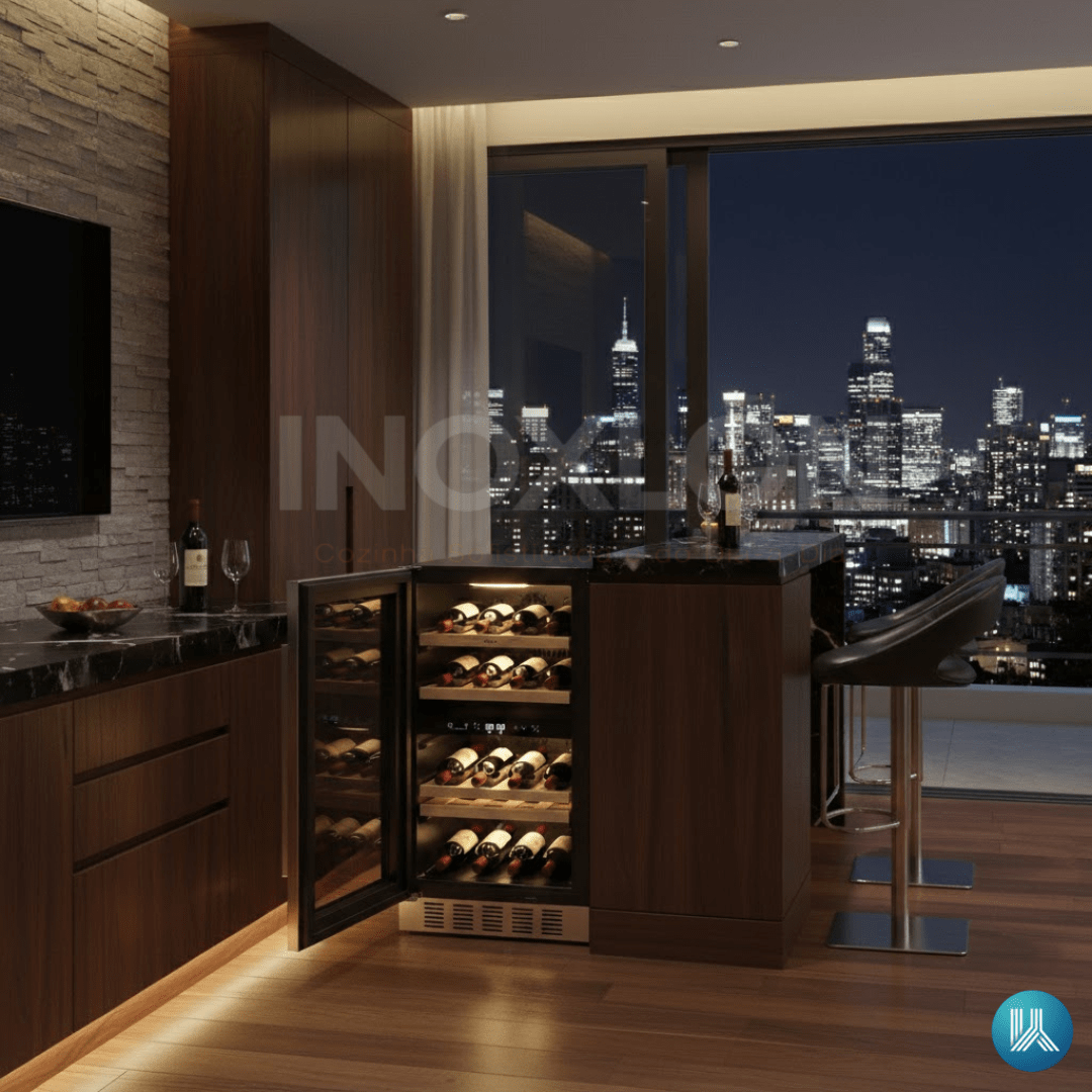 Instalação Built-In com Ventilação Frontal: A adega soluciona a estética da cozinha ou área gourmet ao permitir o embutimento rente à marcenaria. O design frontal inteligente garante a troca de calor necessária sem comprometer os móveis ao redor.
