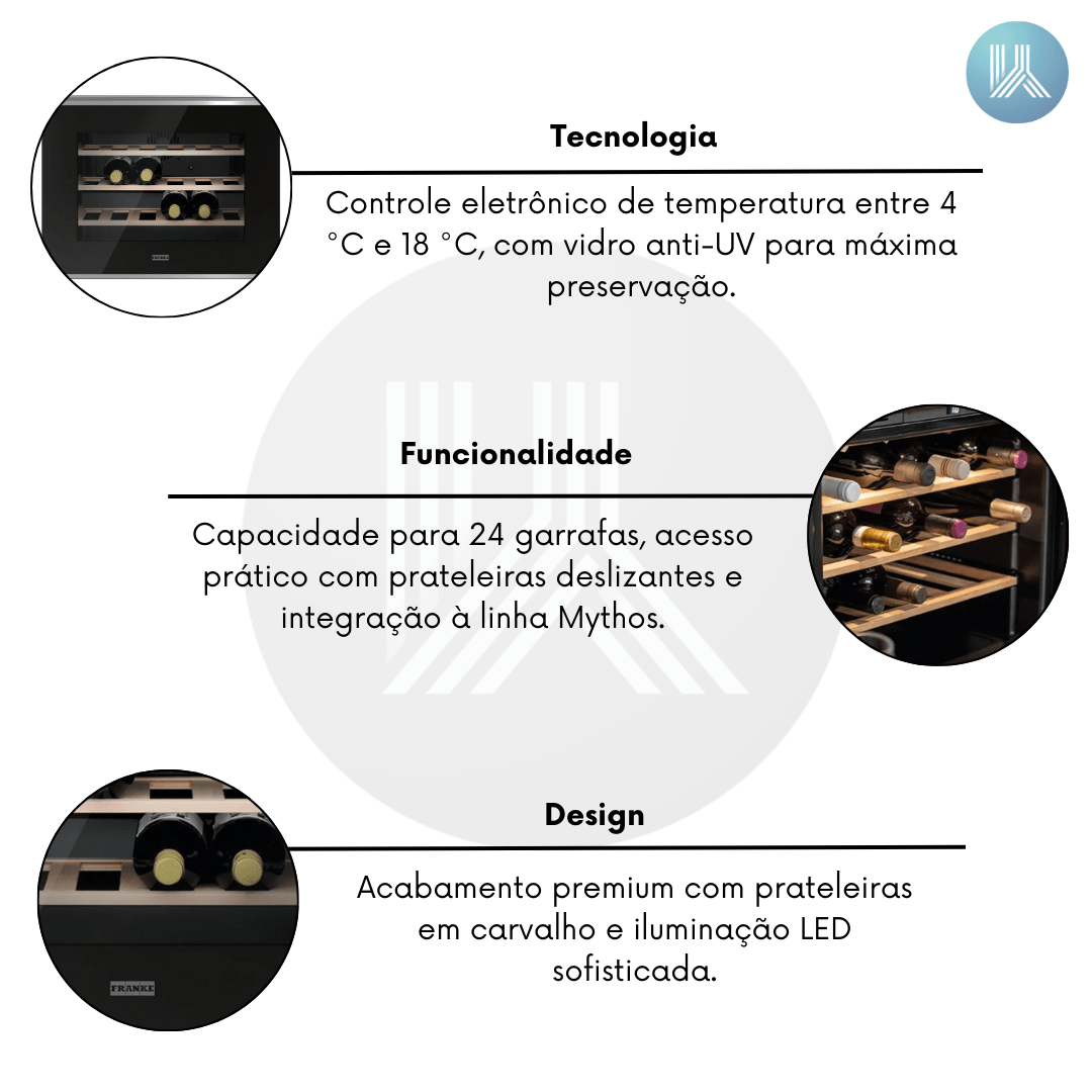 A Adega Mythos Franke FMY 24 WCR XS é a escolha ideal para os apaixonados por vinhos que desejam unir sofisticação, design premium e a máxima preservação da bebida. Integrada à linha Mythos, ela foi projetada para cozinhas planejadas e espaços gourmets, oferecendo armazenamento seguro para até 24 garrafas, sempre na temperatura perfeita. Com detalhes refinados como prateleiras em carvalho e iluminação em LED, transforma qualquer ambiente em uma verdadeira experiência sommelier.