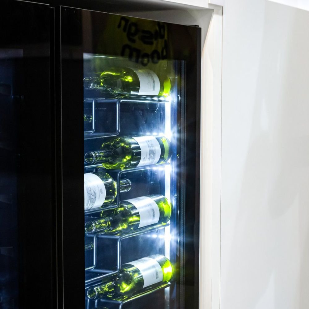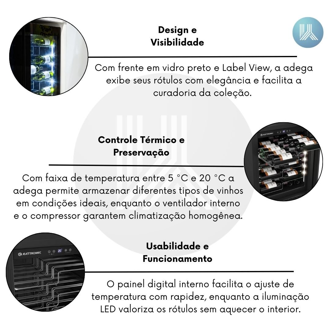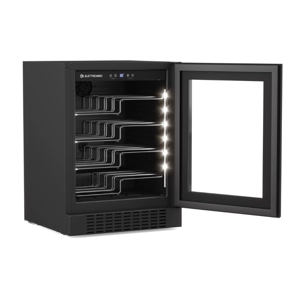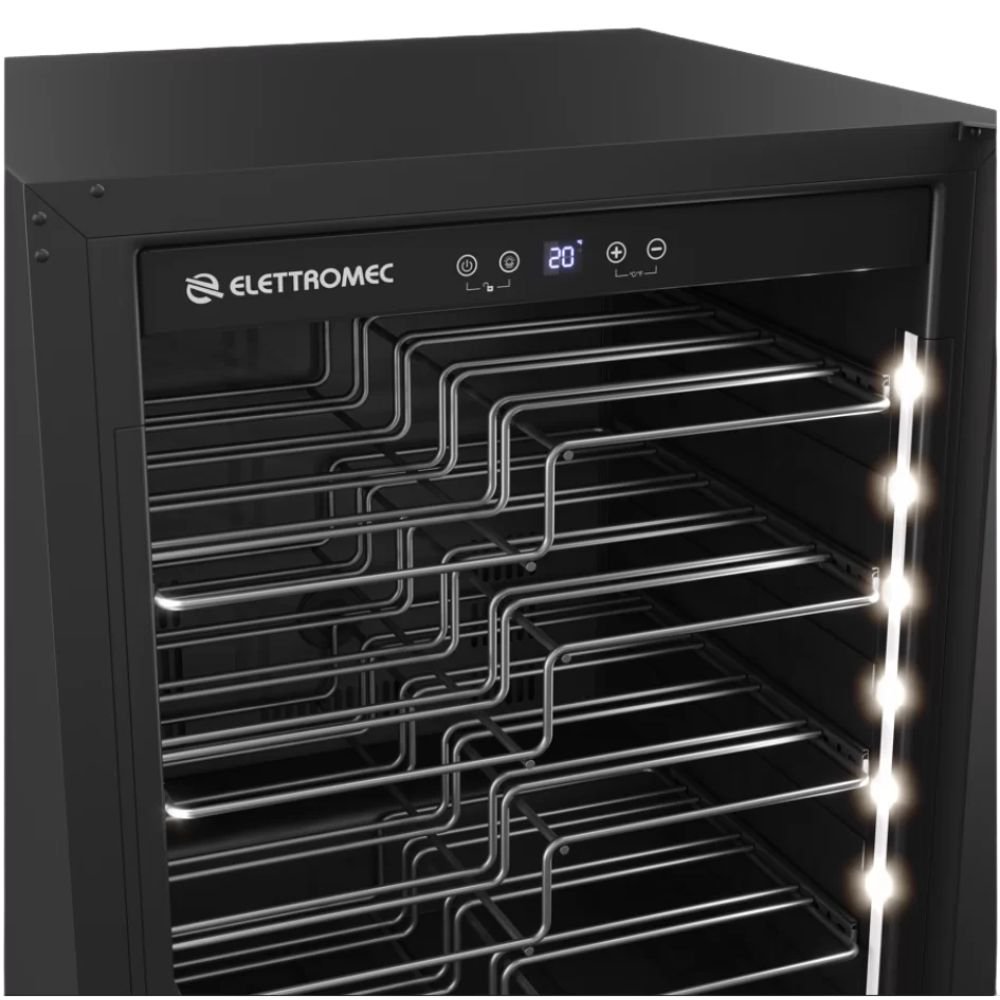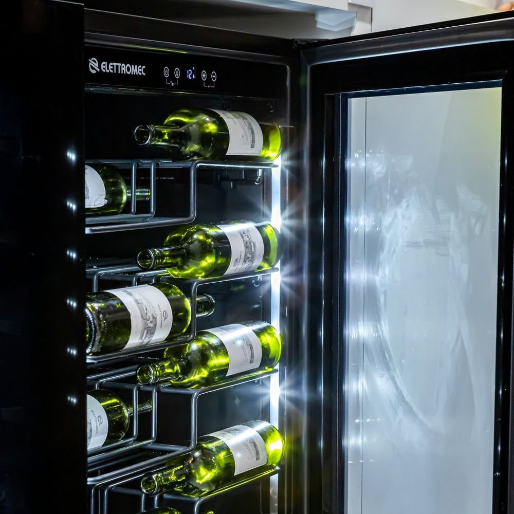 Com faixa de temperatura entre 5 °C e 20 °C, a adega permite armazenar diferentes tipos de vinhos nas condições ideais. O ventilador interno e o sistema por compressor asseguram climatização estável e homogênea em todo o interior. Já a função Energy Cutoff Memory grava a última configuração antes de quedas de energia, protegendo os rótulos contra variações bruscas de temperatura.