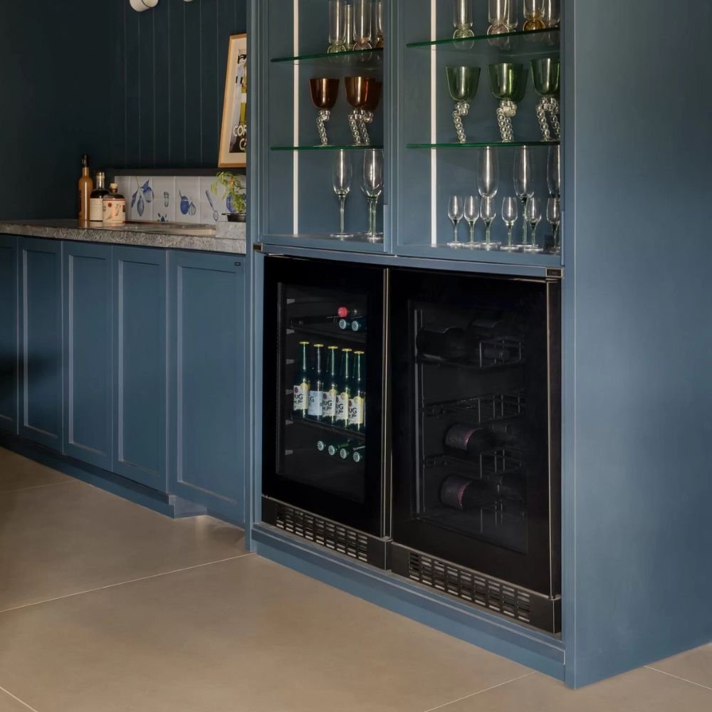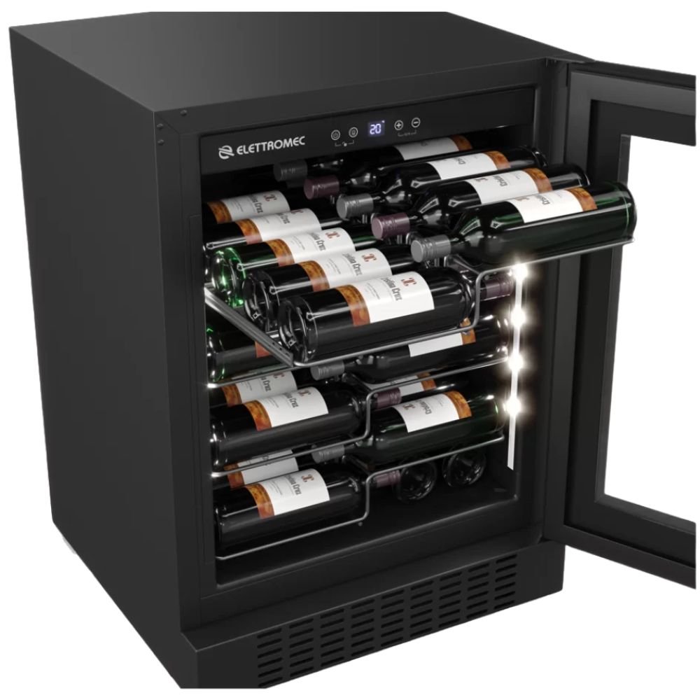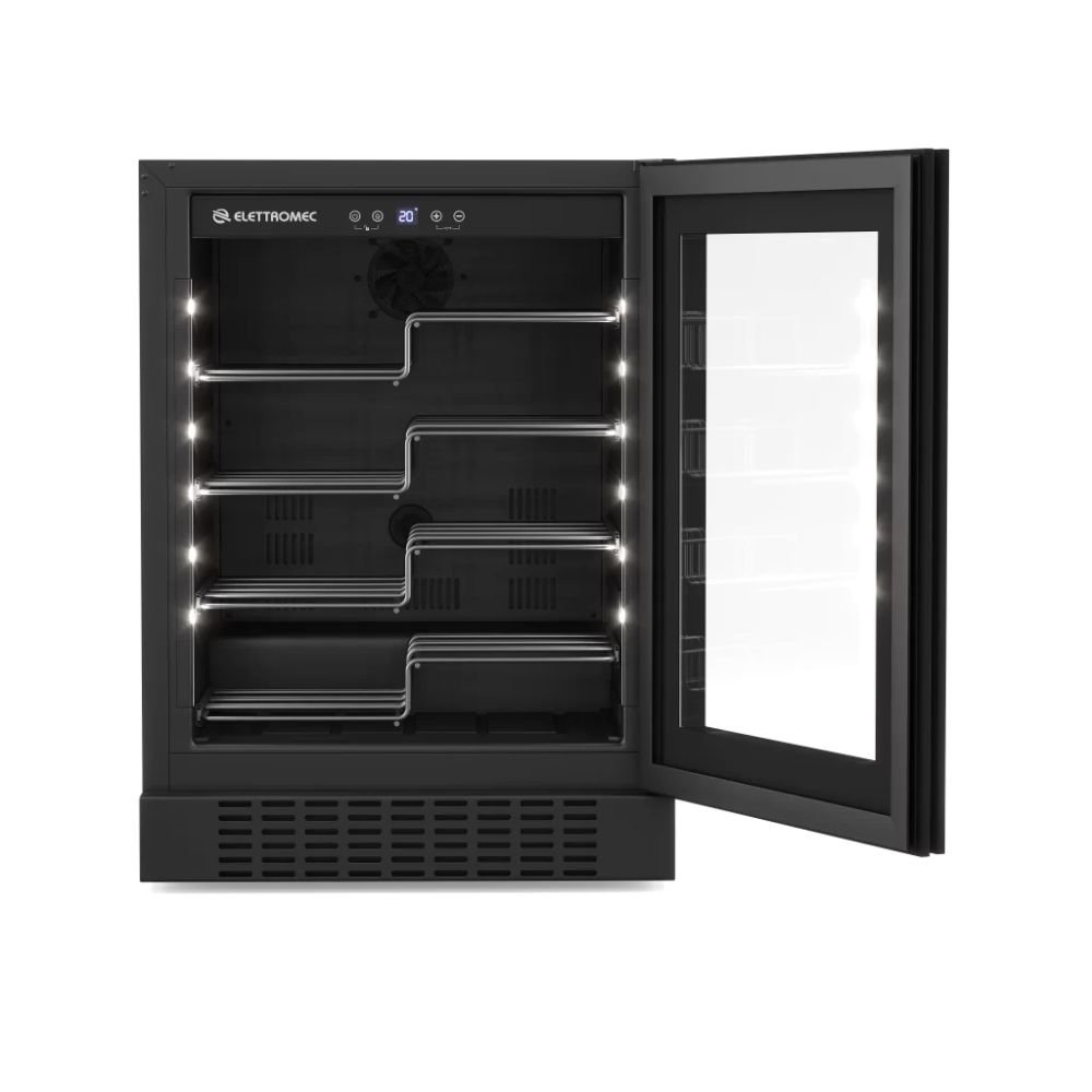 Com frente em vidro preto e Label View, a adega exibe seus rótulos com elegância e facilita a curadoria da coleção. As quatro prateleiras de madeira amortecem vibrações e as corrediças telescópicas 100% garantem deslizamento seguro e acesso total às garrafas. O vidro Low-E reduz a passagem de raios infravermelhos, protege a temperatura interna e preserva a qualidade dos rótulos, tornando a peça perfeita para embutir e exibir a coleção com estilo.