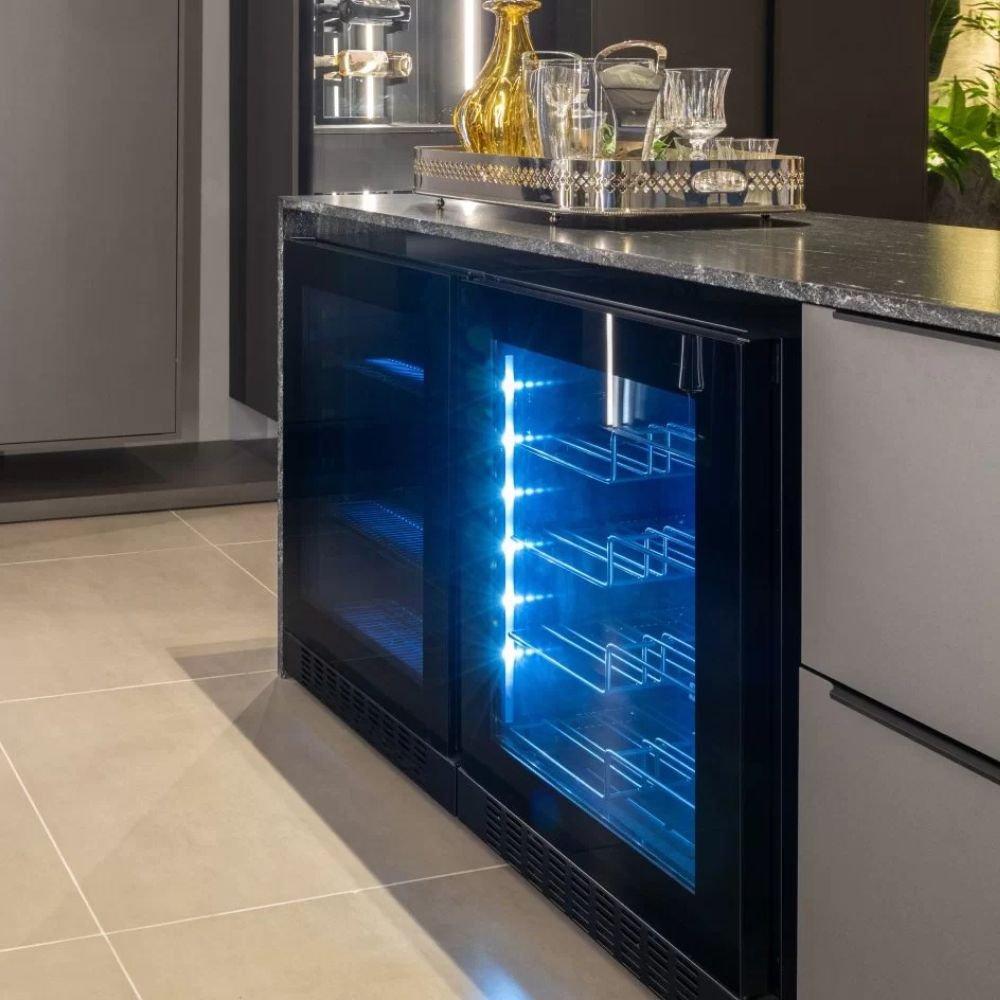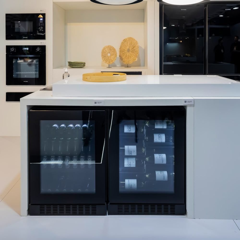 Projetada para embutir ou uso undercounter, a Adega Vetro integra-se a projetos sob medida e combina com a Beer Center Vetro 144 L, formando conjuntos modulares que otimizam espaço. A porta reversível amplia opções de instalação e a estética em vidro preto mantém uniformidade com outros eletros, facilitando harmonização do ambiente e manutenção do projeto.