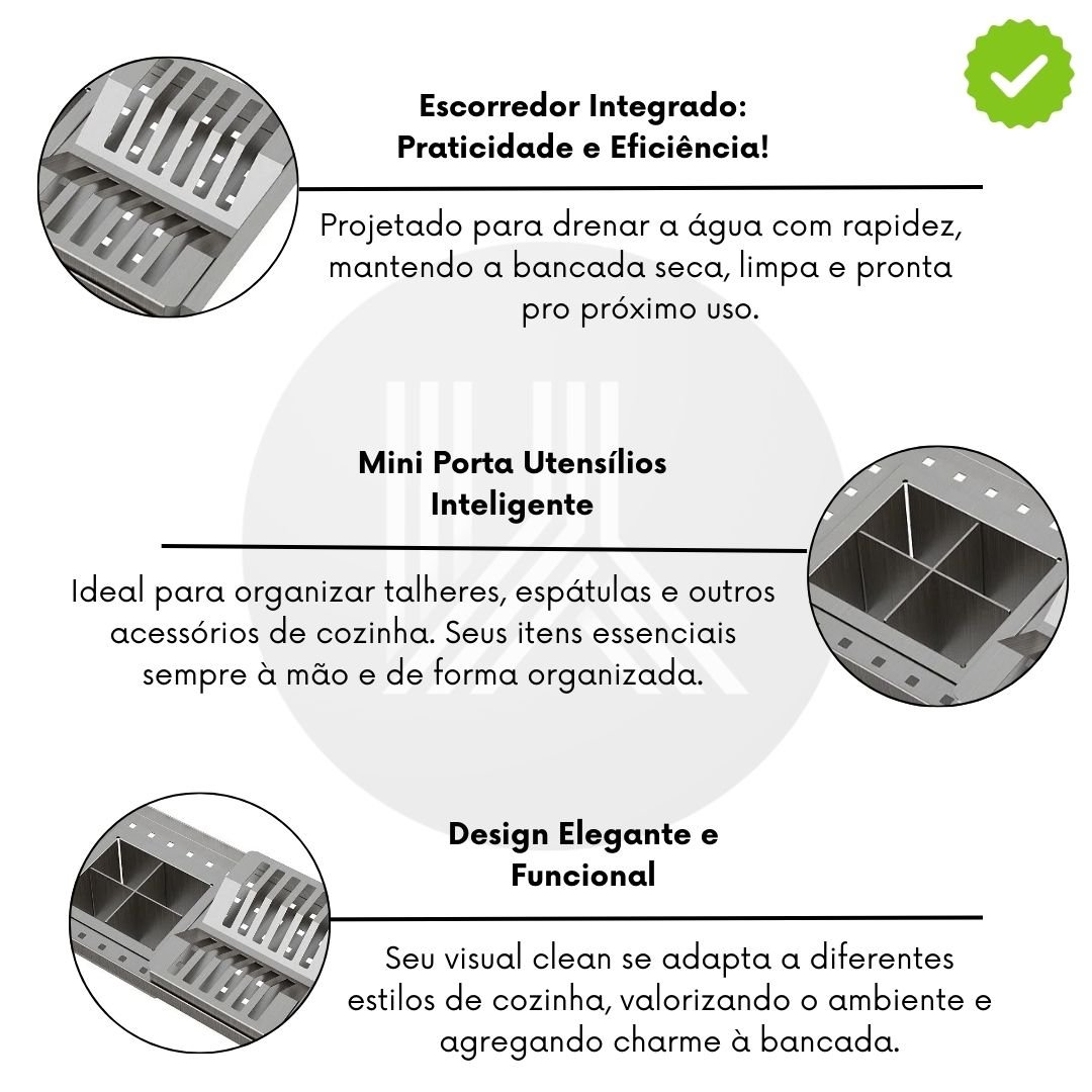 Outro grande diferencial do produto é o mini porta utensílios incluso, ideal para organizar talheres, espátulas e outros acessórios de cozinha. Essa funcionalidade mantém os itens essenciais sempre à mão e de forma organizada, evitando a desordem e otimizando o espaço. Mais do que um detalhe, é um recurso que transforma a rotina em uma experiência muito mais prática.