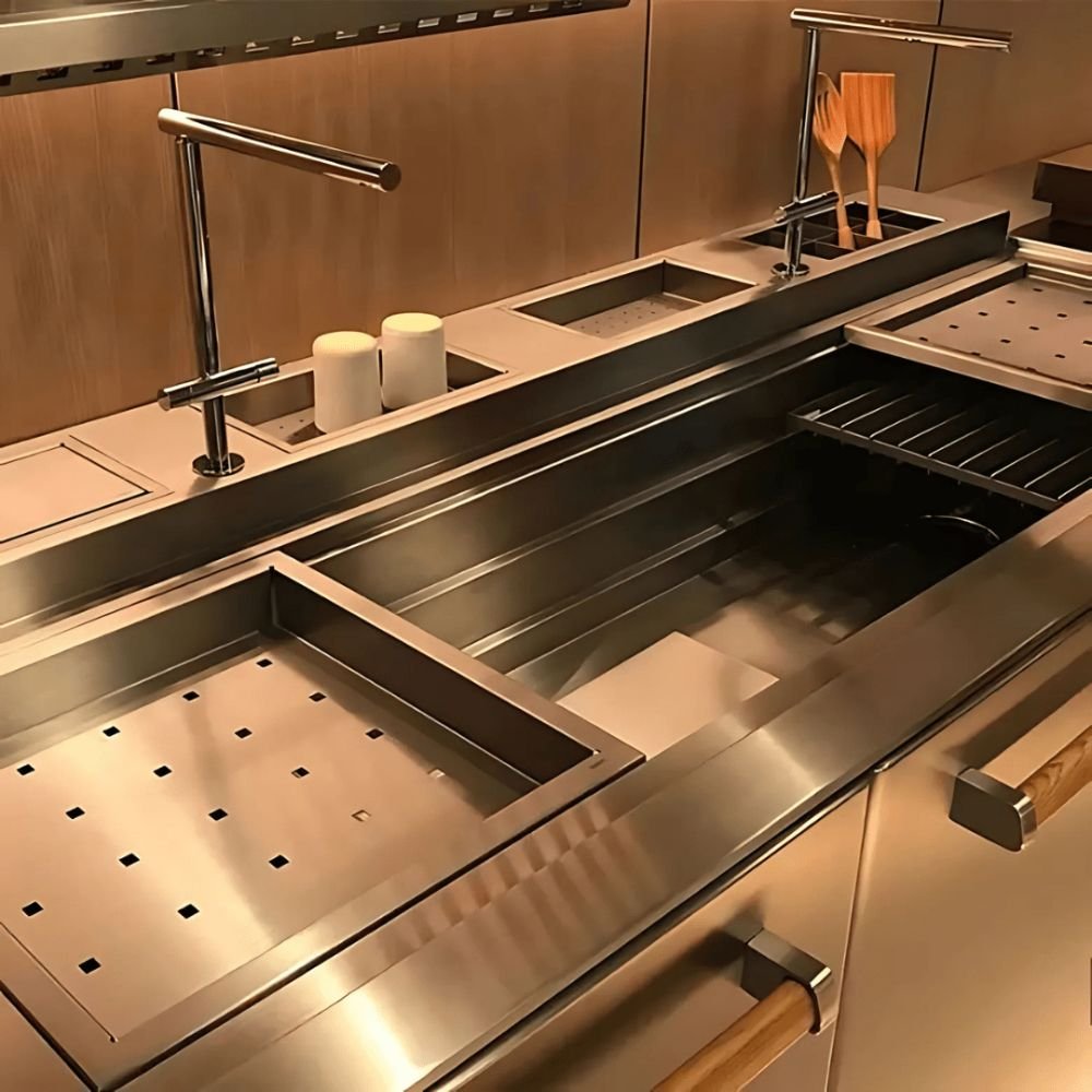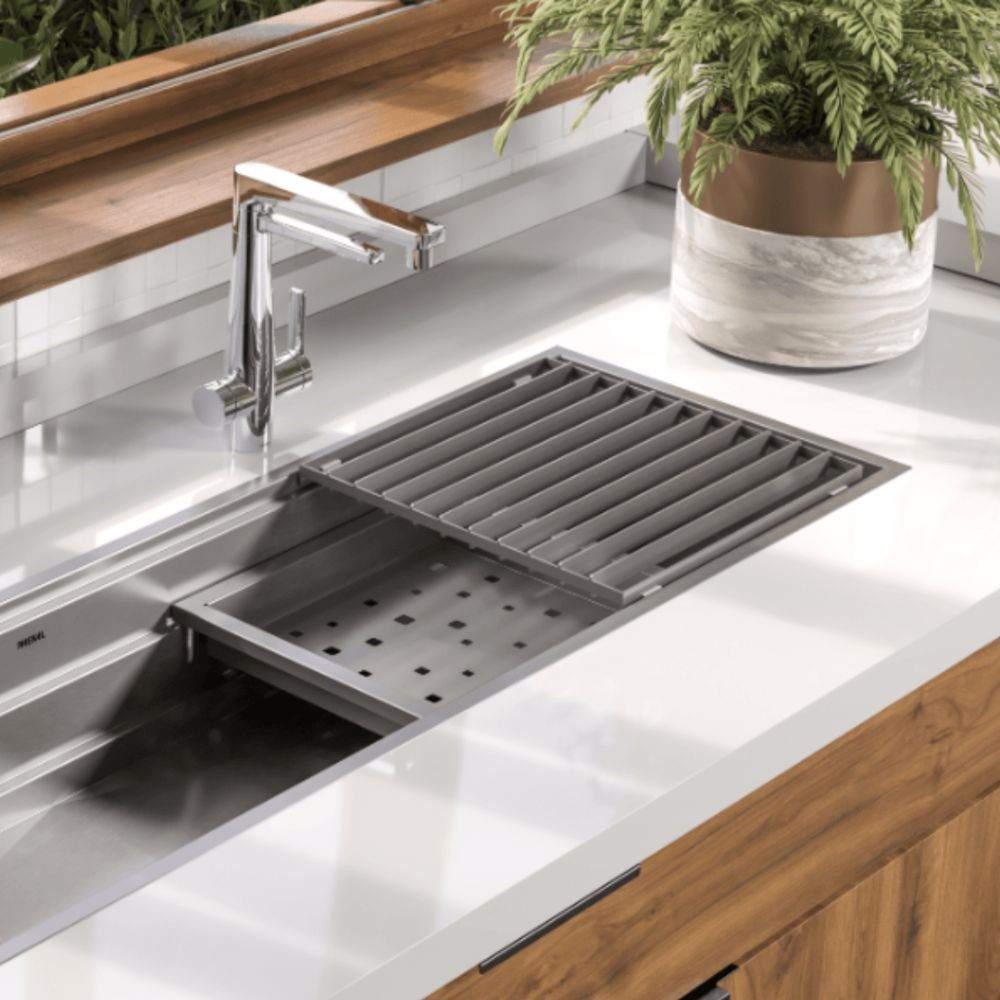 Encaixe Perfeito na Linha Workstation Mekal: Compatibilidade total com cubas como a Workstation 840 Inox Escovada, aproveitando ao máximo o espaço e recursos da cozinha;