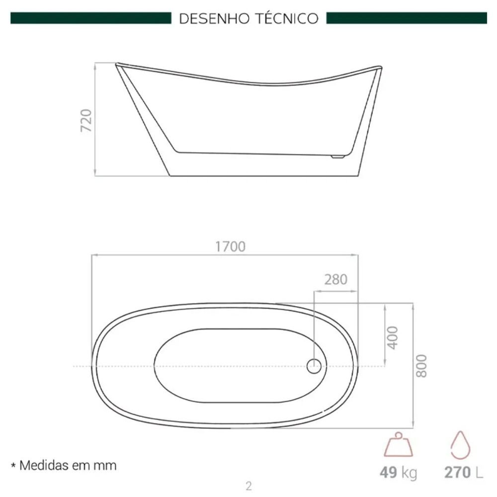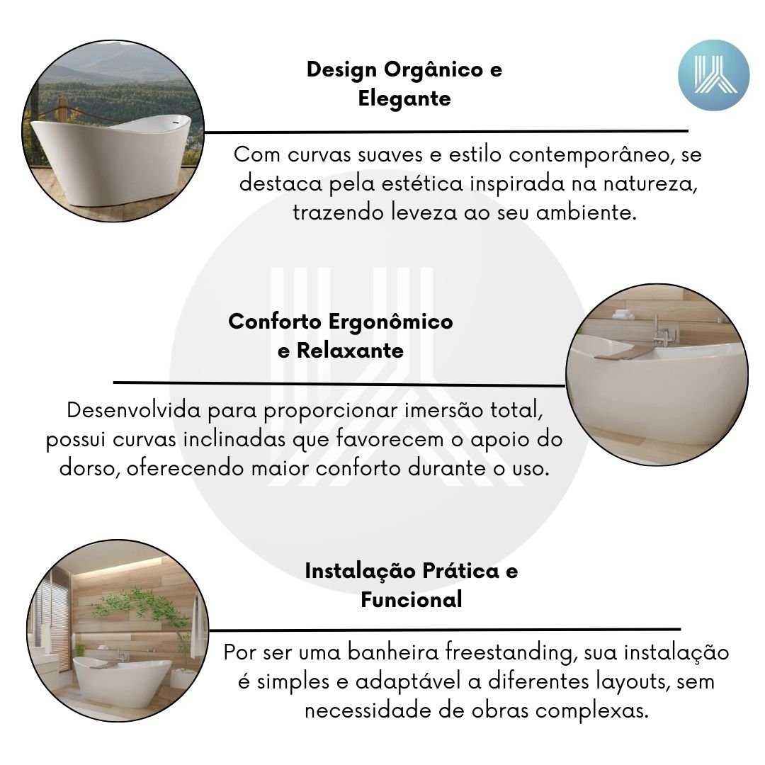 Por ser uma banheira freestanding, sua instalação é simples e adaptável a diferentes layouts, sem necessidade de obras complexas. Leve, com apenas 47 kg, pode ser transportada e instalada com facilidade. Os itens de escoamento acompanham o mesmo acabamento da peça, mantendo a estética limpa e elegante. Essa combinação de praticidade e beleza valoriza qualquer sala de banho.