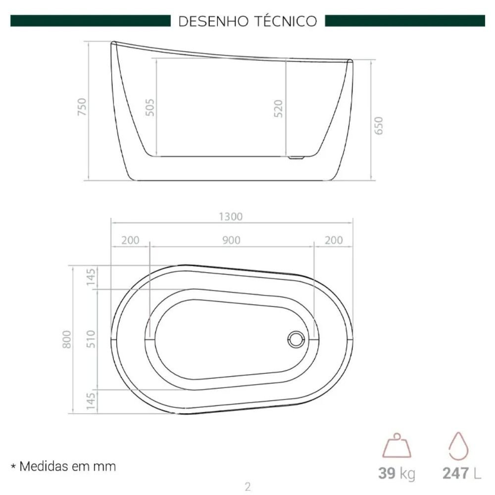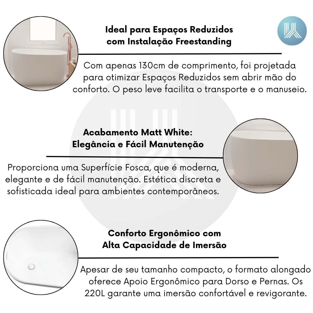 Com apenas 130 cm de comprimento, a banheira Embaú foi desenhada para otimizar Espaços Reduzidos sem abrir mão do conforto. Seu peso leve facilita o transporte e o manuseio. A Instalação Freestanding (autoportante) é rápida e prática, dispensando base de alvenaria e estruturas adicionais, o que permite um Posicionamento Rápido e Versátil em qualquer projeto.