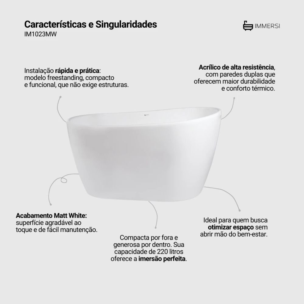 A Banheira de Imersão Embaú Matt White Immersi é a escolha perfeita para quem busca luxo, conforto e funcionalidade em Banheiros Menores. Inspirada na tranquilidade das praias de Santa Catarina, esta banheira de 130 cm de comprimento e 220 litros de capacidade é compacta e leve (apenas 39 kg). Seu principal diferencial é o acabamento Matt White (superfície fosca), que confere um toque moderno e discreto ao ambiente, permitindo um banho de imersão relaxante e restaurador com máximo Apoio Ergonômico para o dorso e pernas.