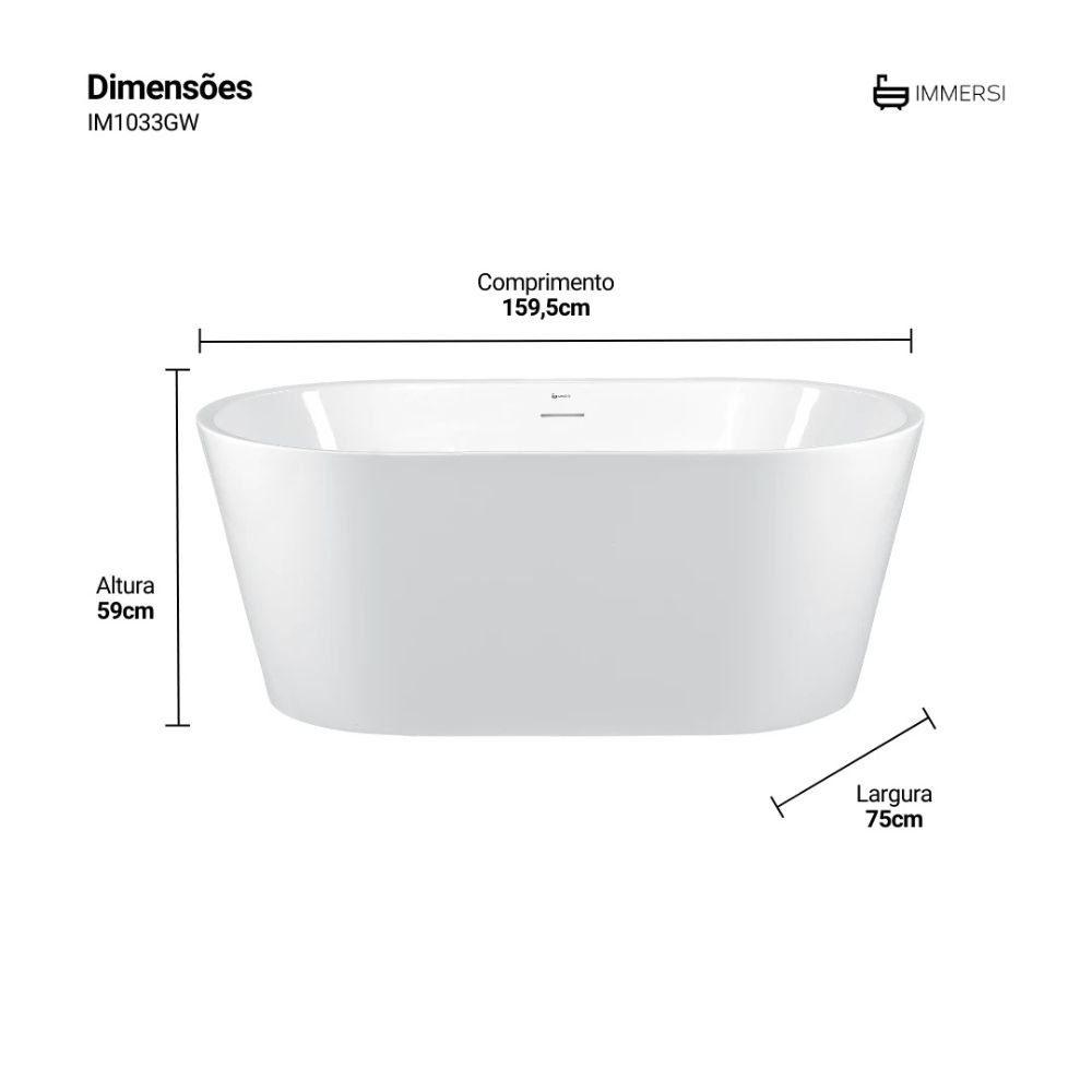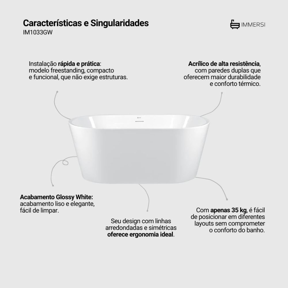 Com apenas 38 kg, a banheira leve é uma excelente escolha para ambientes modernos que valorizam a praticidade, facilitando o transporte e a instalação. O modelo é Freestanding (autoportante), de instalação versátil, e possui Itens de Escoamento Discretos (válvula e ladrão) perfeitamente harmonizados com o design, assegurando um visual clean e garantido por 10 Anos Immersi.