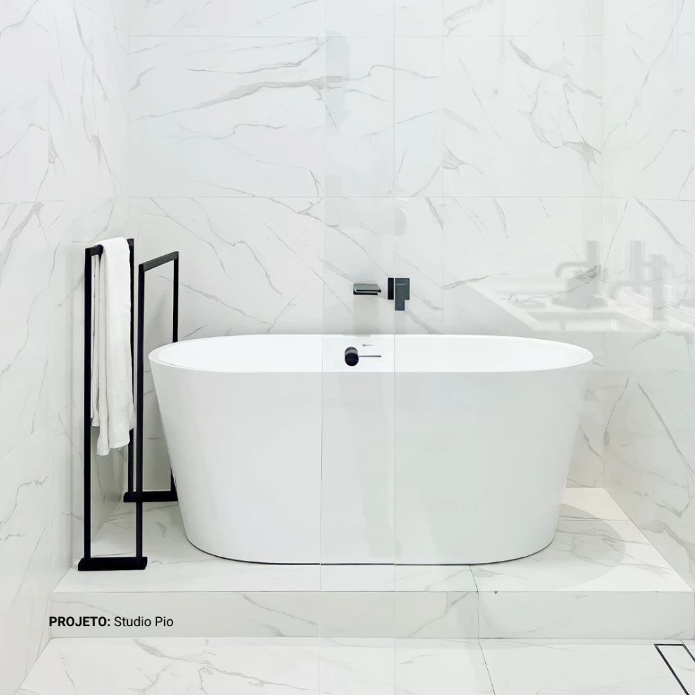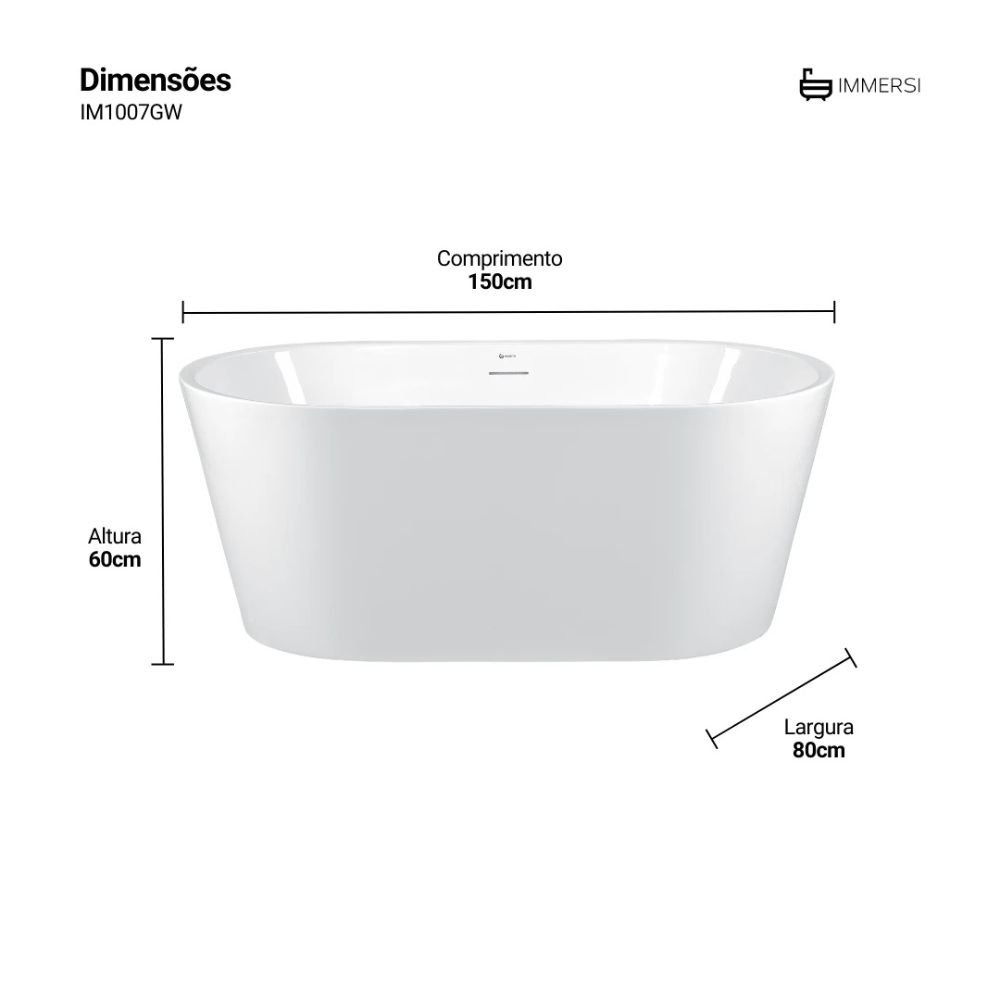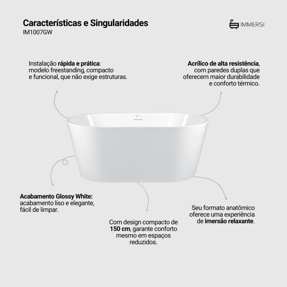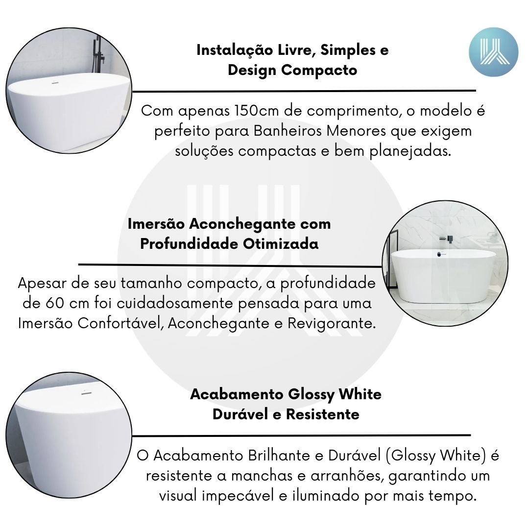 Com apenas 150 cm de comprimento, o modelo é perfeito para Banheiros Menores que exigem soluções bem planejadas. O formato Freestanding (autoportante) da banheira Gamboa Glossy White permite que ela seja posicionada livremente, oferecendo Flexibilidade no Projeto e eliminando a necessidade de alvenaria ou suportes adicionais.