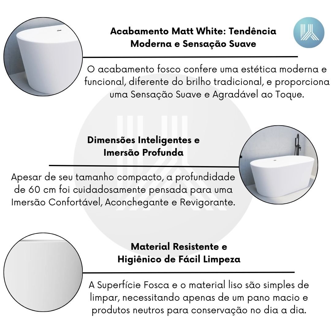 A Superfície Fosca e o material liso são simples de limpar, necessitando apenas de um pano macio e produtos neutros para conservação no dia a dia. Este material acrílico de alta qualidade é resistente e garante que a banheira mantenha sua aparência impecável e seu alto padrão de higiene.
