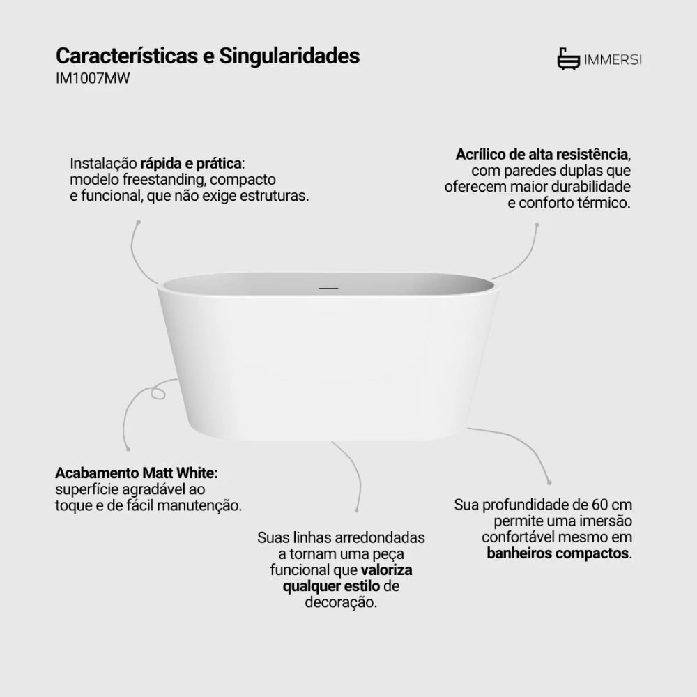 O formato Freestanding da banheira de imersão permite uma Instalação Descomplicada, sem a necessidade de alvenaria ou suportes extras, o que facilita o projeto. A peça pode ser posicionada livremente no ambiente, oferecendo total flexibilidade e adaptabilidade a diferentes layouts de banheiro.