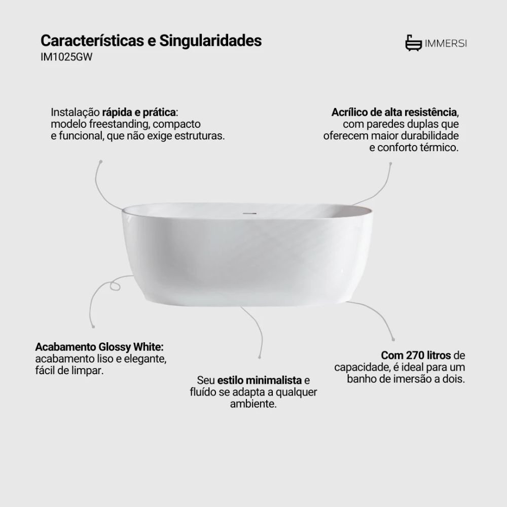 O Design Freestanding simplifica a instalação, pois a banheira não precisa ser instalada em nicho de alvenaria, oferecendo grande Flexibilidade no Posicionamento e facilitando a limpeza do entorno. Além de todos os diferenciais, a Immersi garante a durabilidade e qualidade com uma Garantia de 10 Anos.