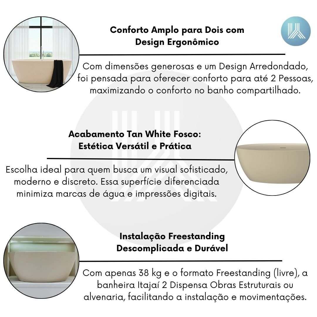 A Banheira de Imersão Itajaí 2 Tan White combina espaço, funcionalidade e design para uma experiência de banho relaxante para duas pessoas. Com 170 cm de comprimento e apenas 38 kg, ela é uma banheira Freestanding que oferece grande flexibilidade no layout da sala de banho. O destaque é o seu acabamento Tan White Fosco, uma tonalidade neutra com leve toque bronzeado que se integra facilmente a diferentes estilos de decoração, garantindo uma estética moderna e sofisticada.