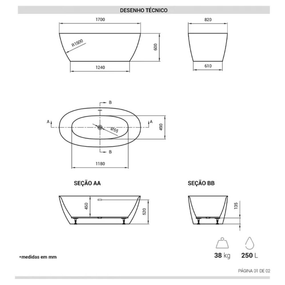 Sendo uma banheira freestanding (autônoma) e pesando apenas 38 kg, a instalação é muito mais simples e sem sujeira, se comparada a modelos embutidos. O material acrílico é de alta resistência, o que garante durabilidade, e é não poroso e de fácil limpeza, assegurando a manutenção da peça sem esforço.