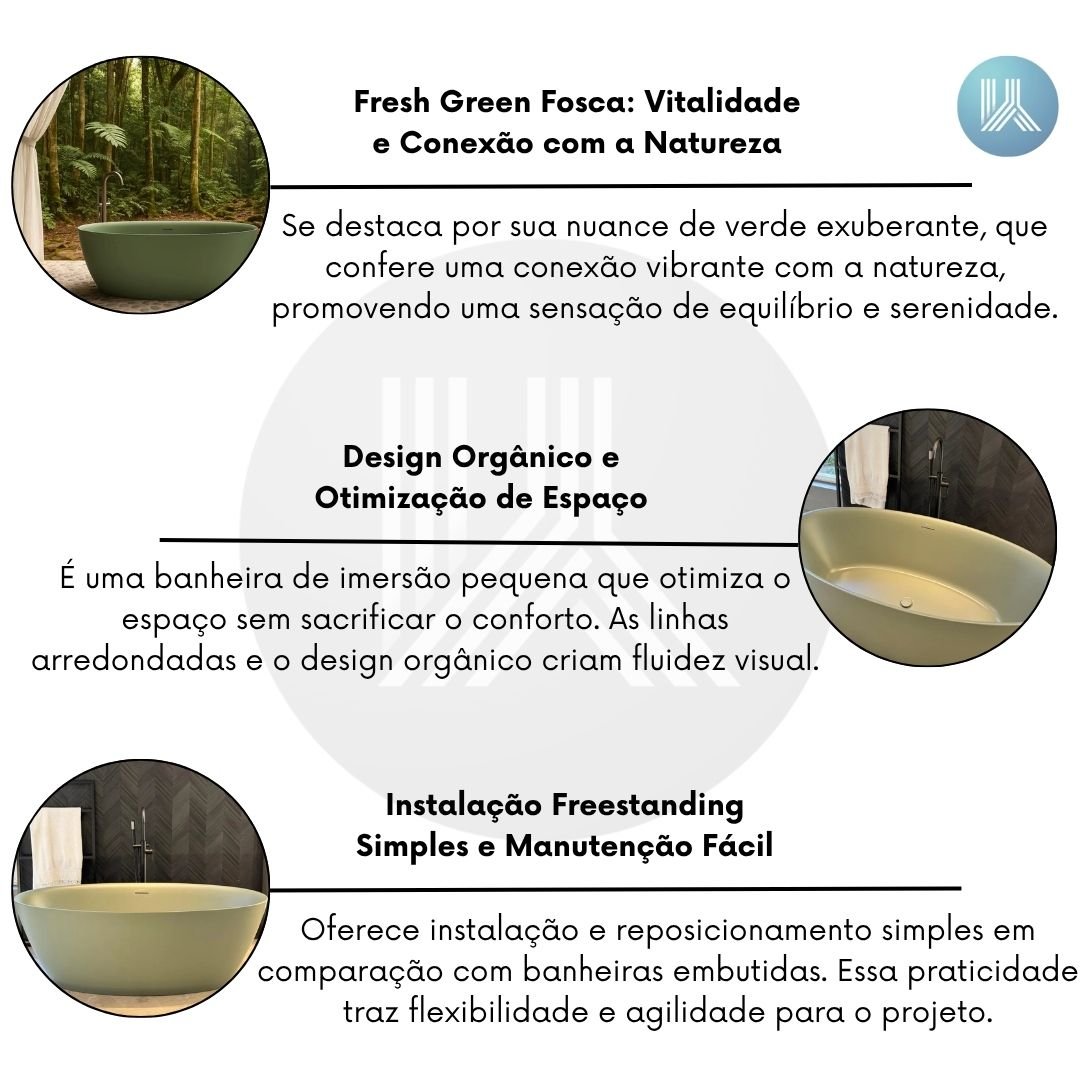 Com design orgânico e linhas arredondadas, a banheira Itajaí Fresh Green proporciona uma fluidez e uma atmosfera acolhedora à sala de banho, otimizando o espaço. Esta banheira de imersão freestanding (livre no ambiente) possui instalação prática e manutenção simplificada. A tonalidade Fresh Green (verde exuberante) confere uma nuance que inspira sensação de vitalidade, frescor e uma conexão vibrante com a natureza, promovendo equilíbrio e tranquilidade no seu momento de banho e bem-estar.