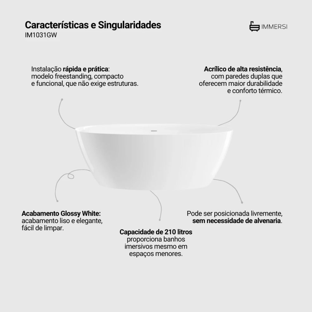 A banheira de imersão Itajaí Glossy White foi feita para quem deseja relaxar sem abrir mão de praticidade. Inspirada nas paisagens tropicais do litoral catarinense, ela traz o clima de um refúgio natural para dentro da sua casa. Com 150 cm de comprimento, 34 kg e capacidade para 210 litros, esta banheira freestanding é leve, fácil de transportar e instalar, dispensa alvenaria e garante manutenção descomplicada no dia a dia. Seu acabamento glossy white é agradável ao toque e combina com diferentes estilos de banheiro.