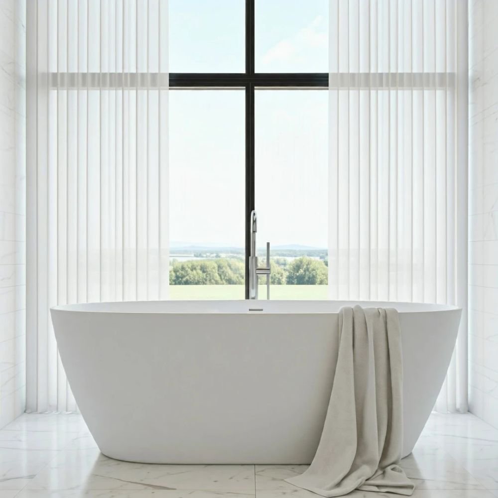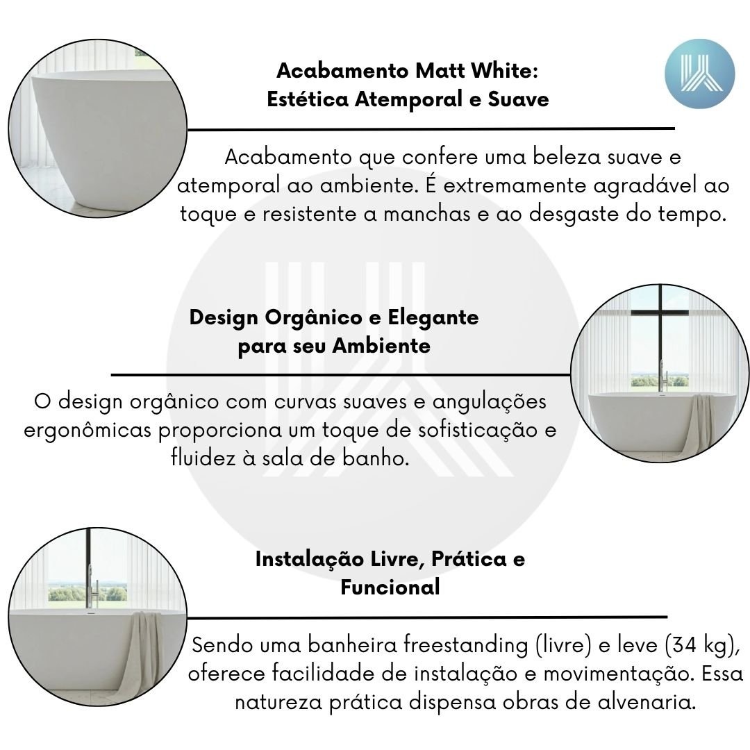 O acabamento em branco fosco confere à banheira uma beleza suave e atemporal, ideal para um design sofisticado que perdura por muitos anos. A superfície fosca é extremamente agradável ao toque e, devido à sua composição acrílica, é resistente a manchas e ao desgaste, garantindo a aparência impecável por muito tempo.