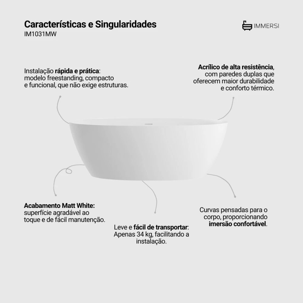 Sendo uma banheira freestanding (livre) e leve (34 kg), oferece facilidade de instalação e transporte. Sua natureza prática e funcional dispensa alvenaria, o que garante confiabilidade e agilidade no uso diário e permite mais liberdade no layout do seu espaço.