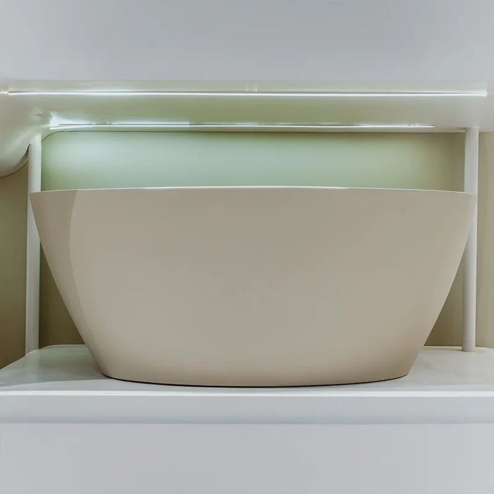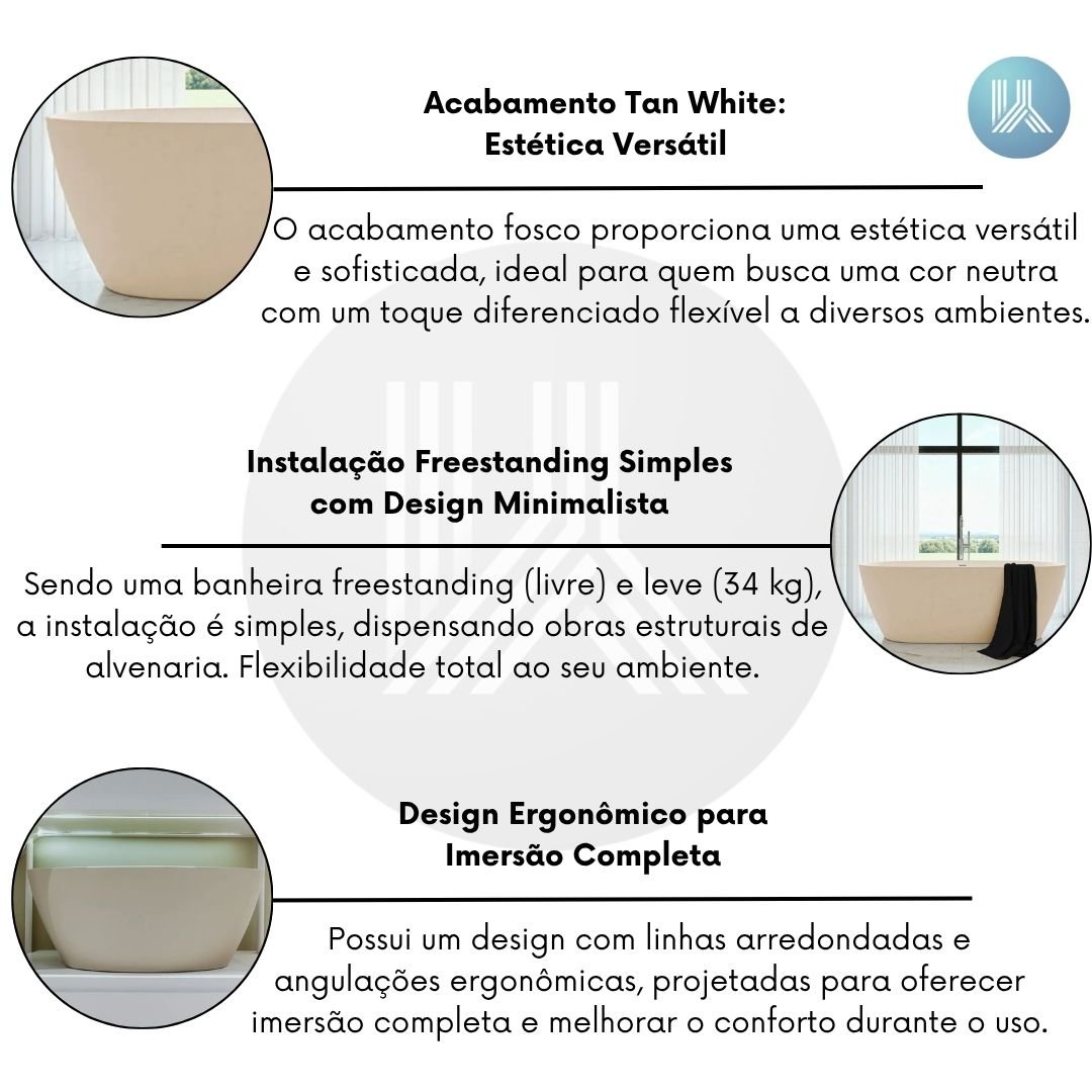Sendo uma banheira freestanding (livre) e leve (34 kg), a instalação é simplificada, dispensando obras estruturais de alvenaria. Essa característica confere flexibilidade na disposição do ambiente, permitindo que você mude o layout do seu banheiro com praticidade, sem abrir mão de um design minimalista.
