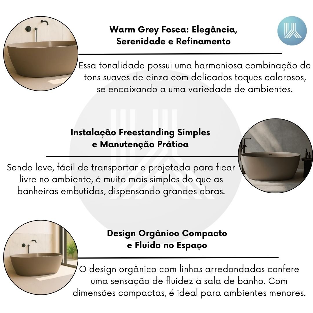Sendo uma banheira freestanding e pesando apenas 34 kg, a instalação é muito mais simples do que a das banheiras embutidas, dispensando grandes obras. Além da facilidade de transporte, o material acrílico é não poroso e de fácil limpeza, o que garante a manutenção prática e a durabilidade do acabamento fosco.