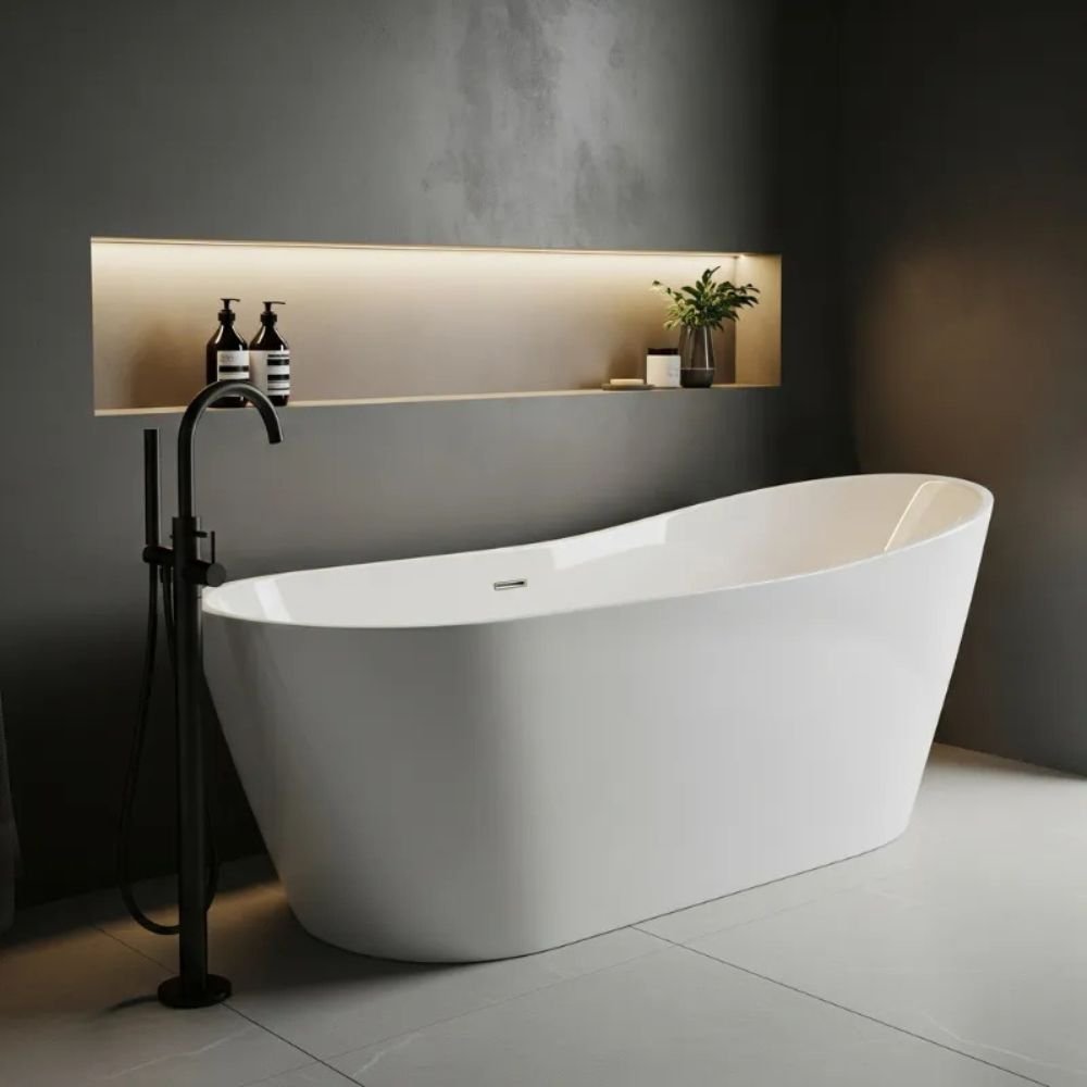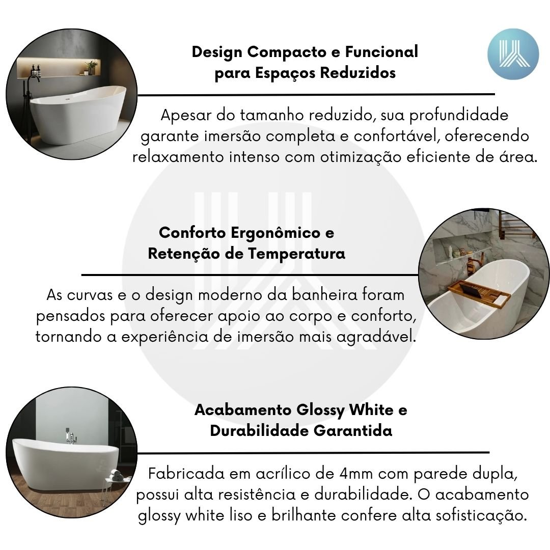 A banheira freestanding (autônoma) oferece instalação prática em diferentes layouts, sem necessidade de alvenaria ou grandes obras. Seu peso leve (38 kg) facilita tanto o transporte quanto a instalação, conferindo confiabilidade e funcionalidade no dia a dia, além de ter manutenção simplificada.