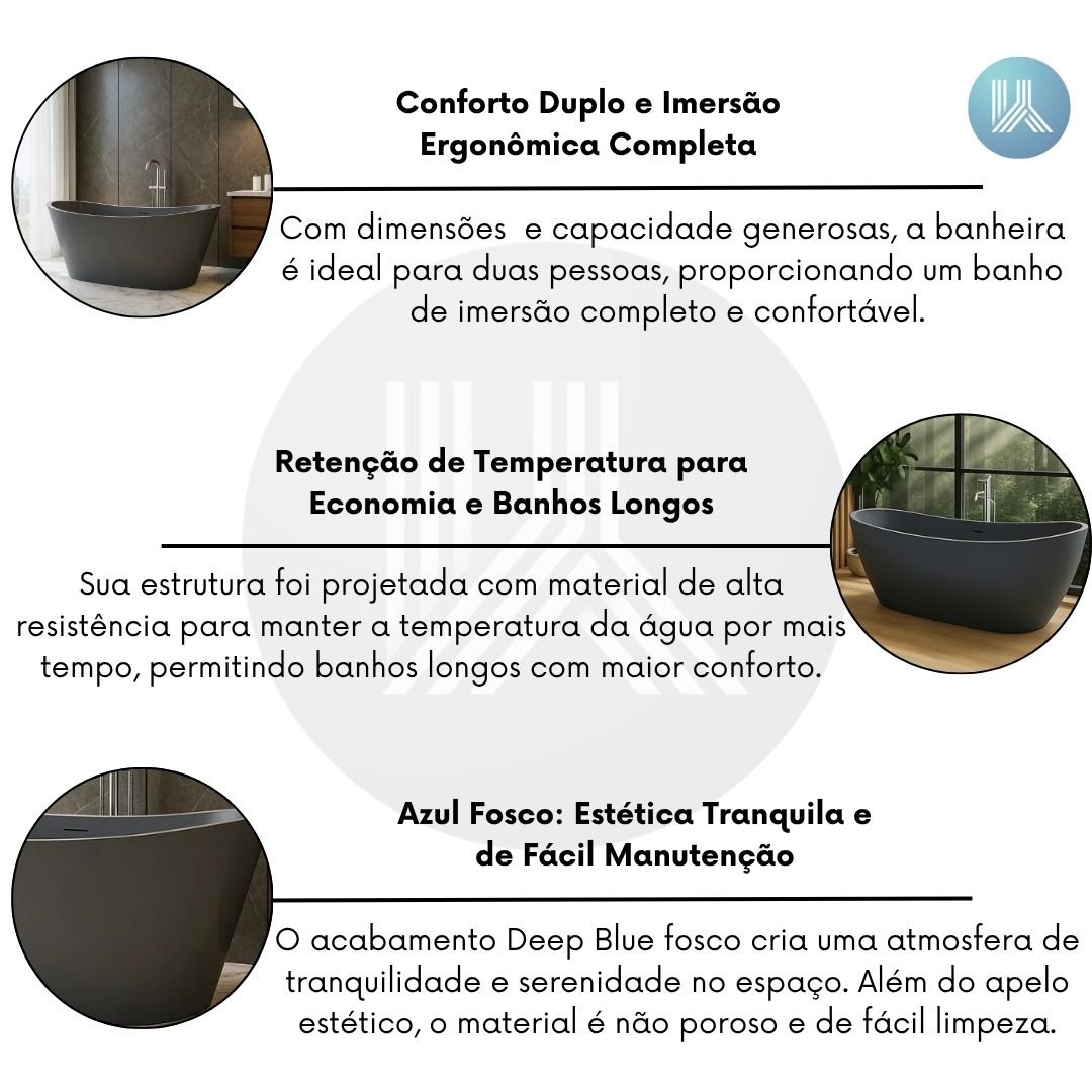 A Banheira Porto Belo Deep Blue é uma banheira de imersão freestanding para duas pessoas, projetada para quem busca conforto e funcionalidade em banheiros residenciais ou projetos de hospedagem. Com 170 cm de comprimento e 45 kg, ela permite instalação prática sem a necessidade de grandes obras, facilitando a renovação do ambiente. O acabamento Deep Blue fosco contribui para criar uma atmosfera de tranquilidade, além de ser fácil de limpar e reduzir marcas de uso frequente.
