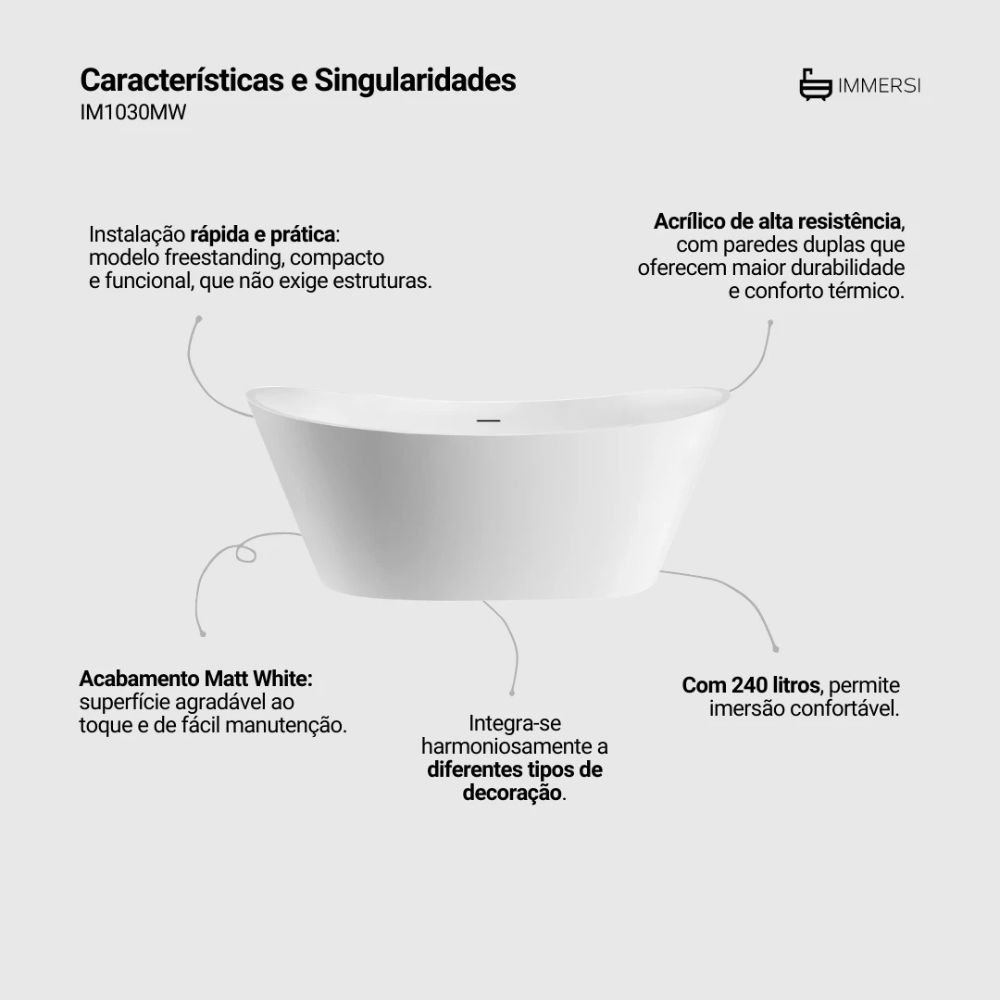 O design diferenciado da banheira se destaca por suas curvas suaves e elegantes, que se adaptam a diversos estilos de projeto. A Porto Belo Matt White é uma peça freestanding que oferece fluidez ao ambiente, permitindo que a banheira seja o ponto focal de design, com um toque de modernidade inigualável.
