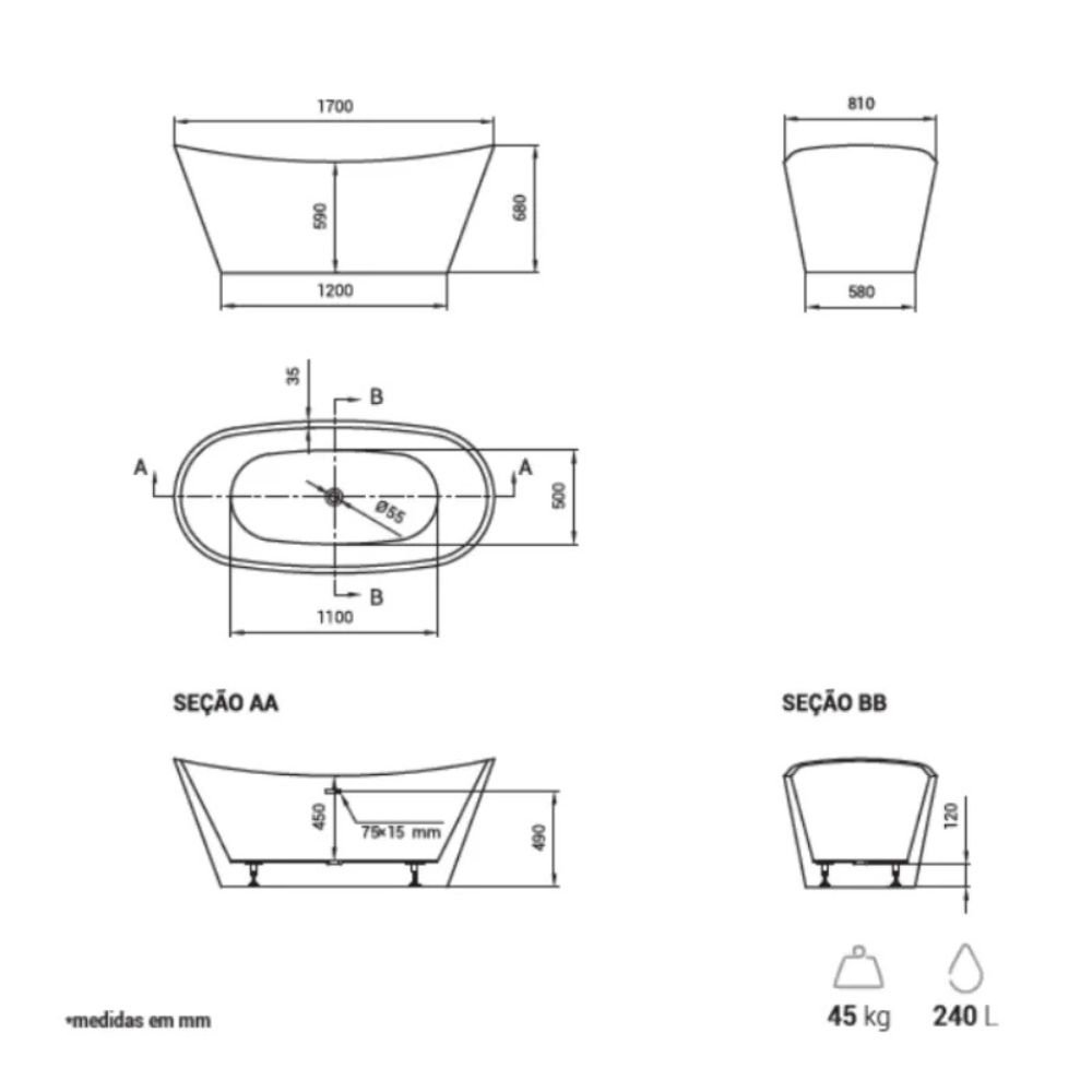 Com 170 cm de comprimento, a banheira possui dimensões generosas que a tornam perfeita para dois, proporcionando um banho relaxante a dois. Suas curvas suaves e angulações ergonômicas garantem que a imersão seja confortável e completa, transformando o banho em um momento de cuidado e bem-estar.