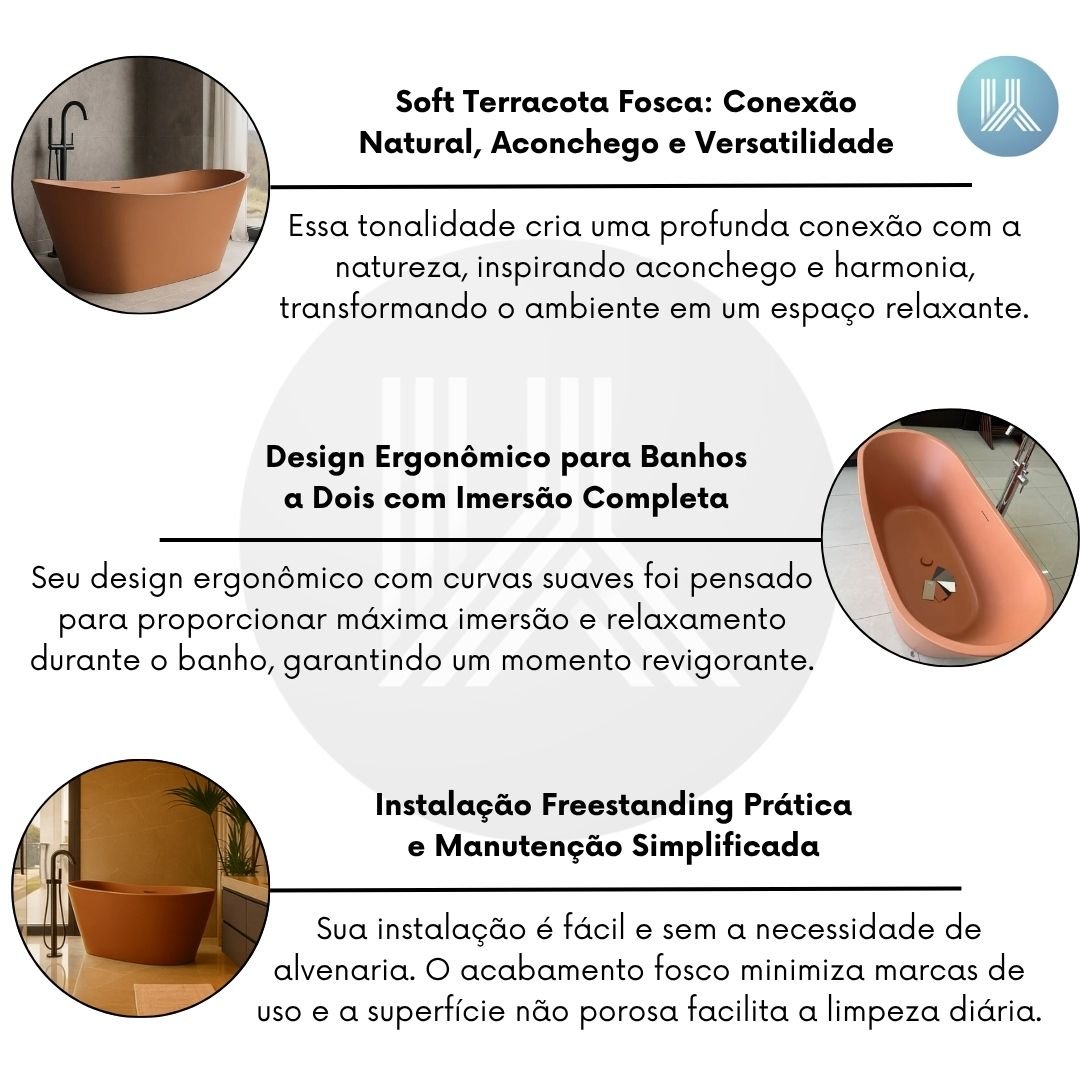 A tonalidade Soft Terracota cria uma profunda conexão com a natureza, inspirando aconchego e harmonia, o que transforma o ambiente de banho em um espaço relaxante. O acabamento fosco não só valoriza o visual da peça, mas também lhe confere uma estética atemporal e sofisticada, permitindo a integração com diversos estilos de decoração.
