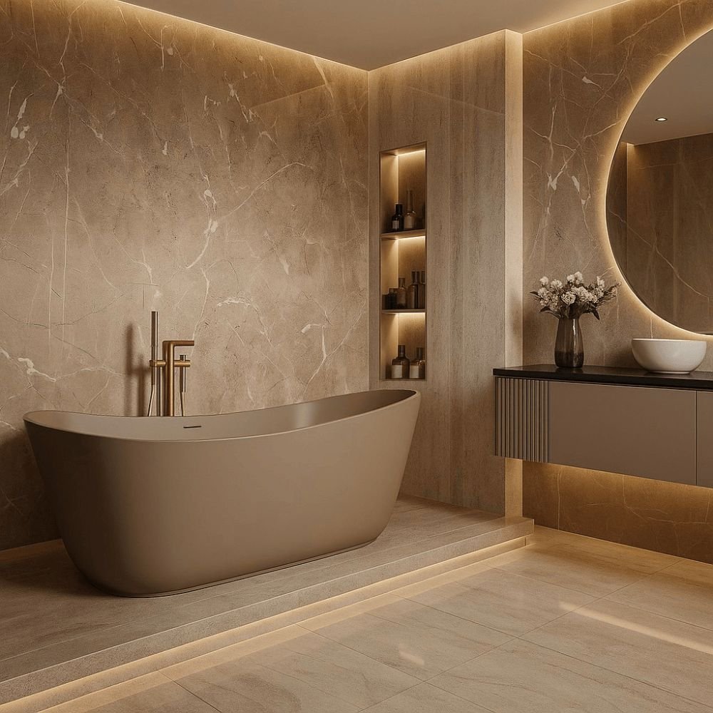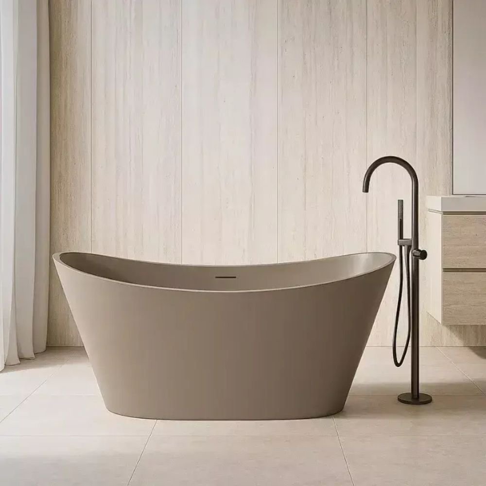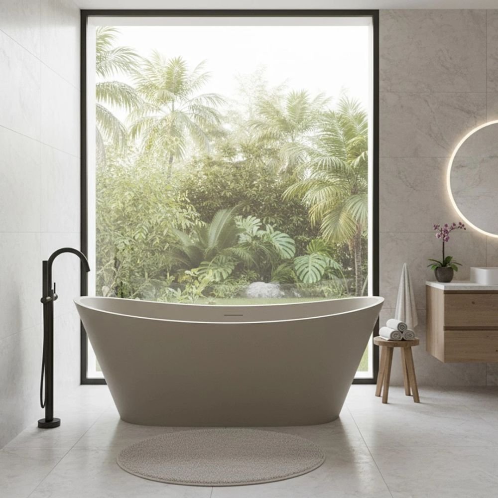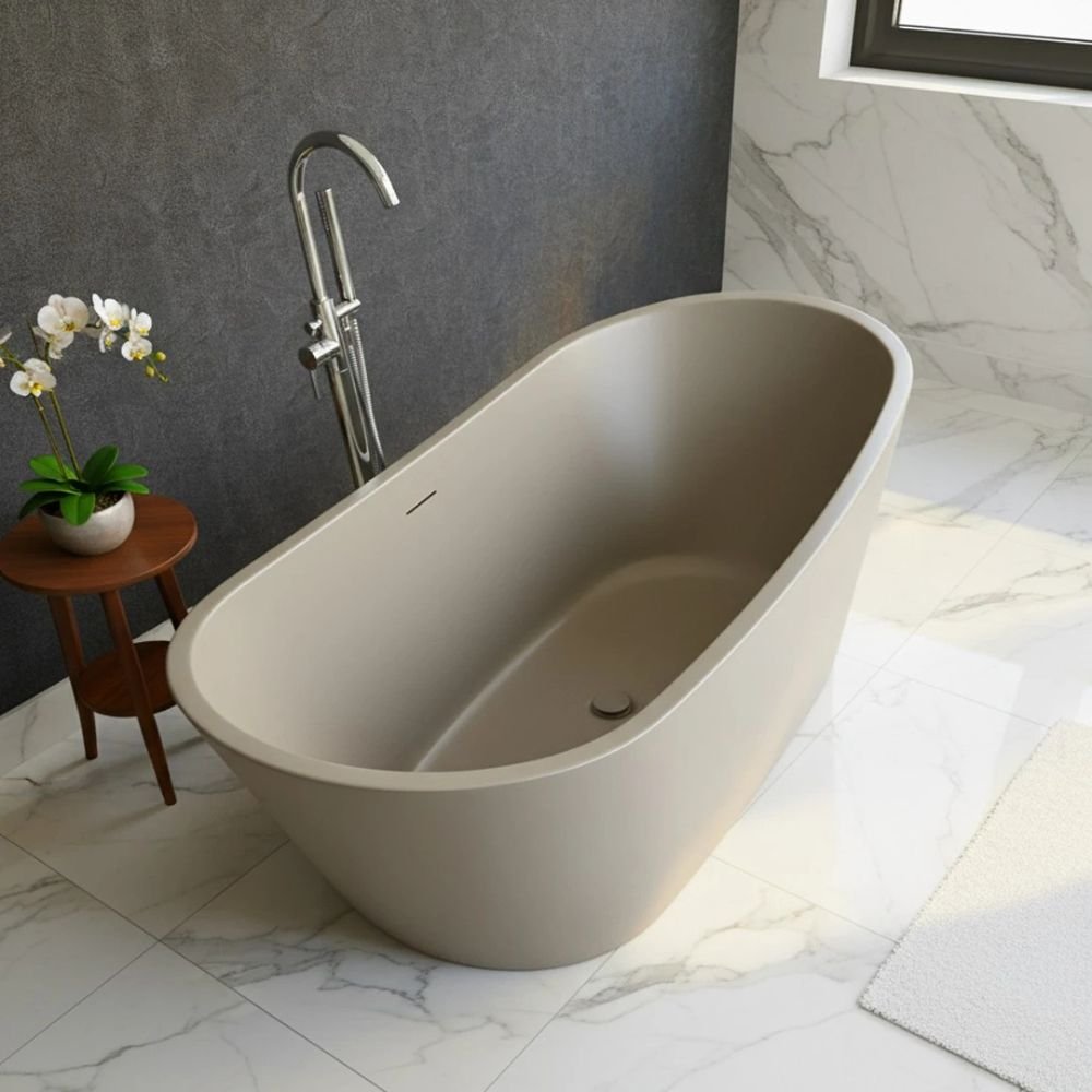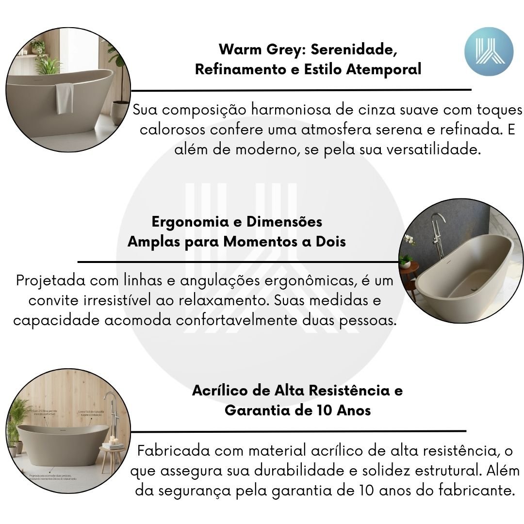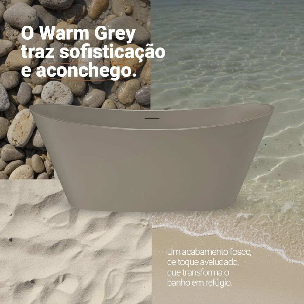 O grande diferencial deste modelo caracteriza-se por uma harmoniosa composição de cinza suave com toques calorosos, o que confere à banheira uma atmosfera serena e refinada. Este acabamento fosco, além de moderno, se destaca pela sua versatilidade, encaixando-se perfeitamente em projetos que buscam um estilo atemporal de sofisticação e conforto.