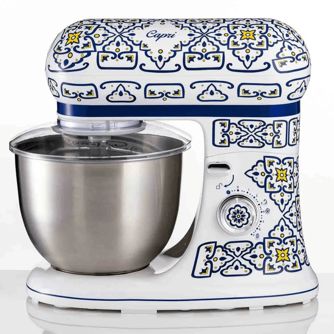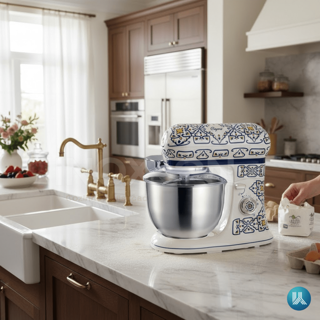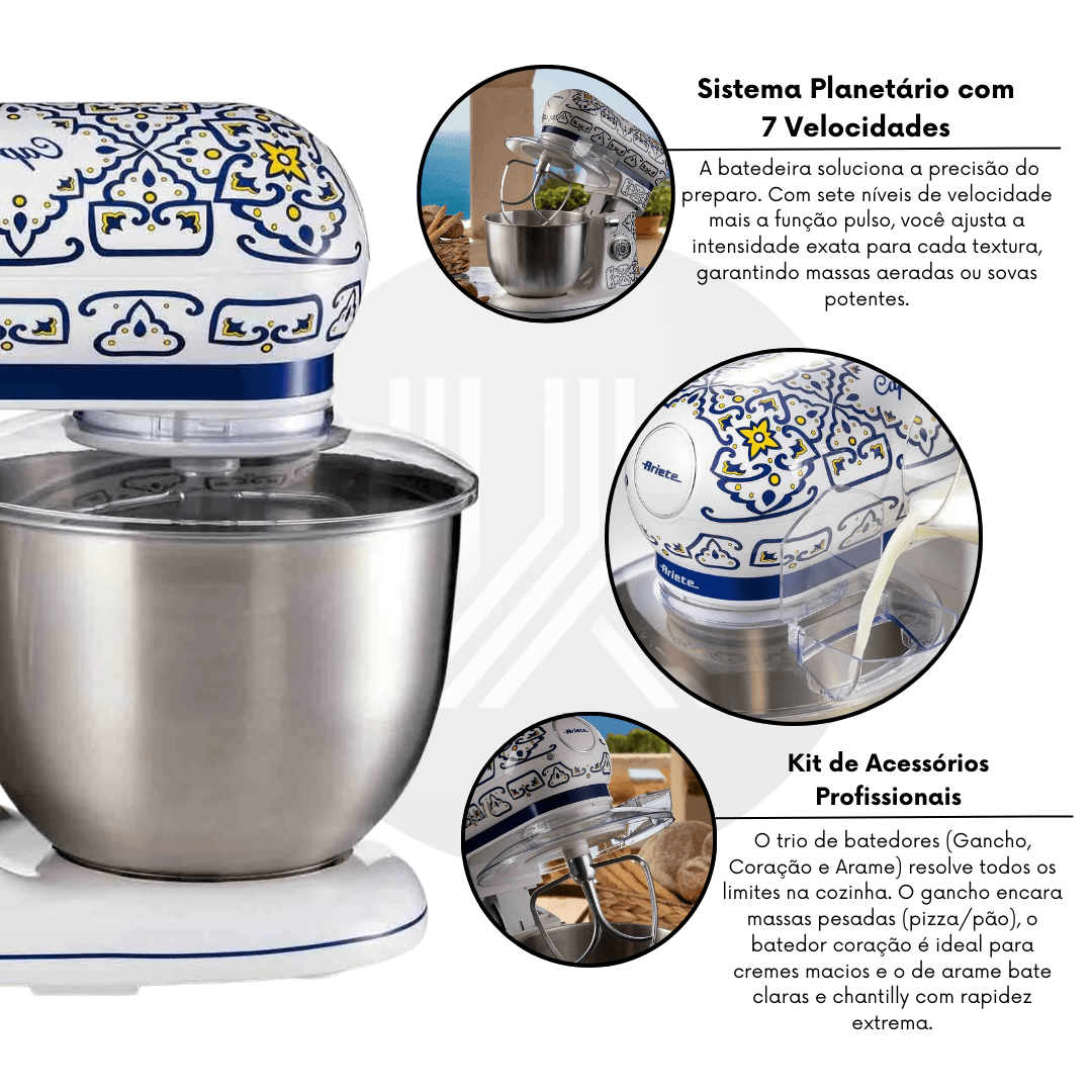 Design Mediterrâneo Exclusivo: A estampa inspirada no Mediterrâneo resolve a busca por sofisticação. Mais que um utensílio, esta planetária é uma peça decorativa de luxo que traz cor e vida para cozinhas de alto padrão.