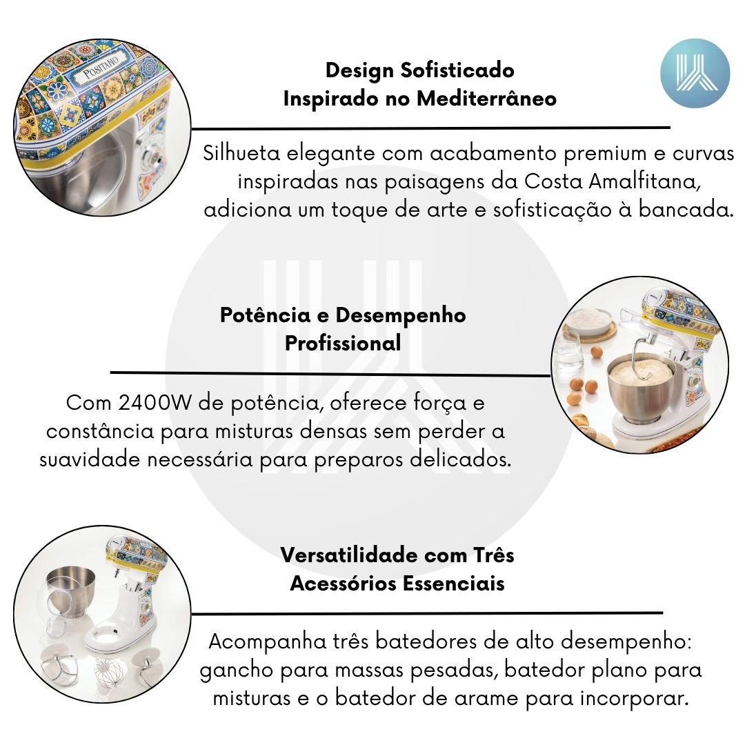 Com 2400W de potência e motor de alta performance, a Batedeira Planetária Positano oferece força e constância para misturas densas e massas pesadas, sem perder a suavidade necessária para preparos delicados. Suas 7 velocidades permitem controle total sobre o processo, garantindo resultados homogêneos e texturas perfeitas em cada receita.