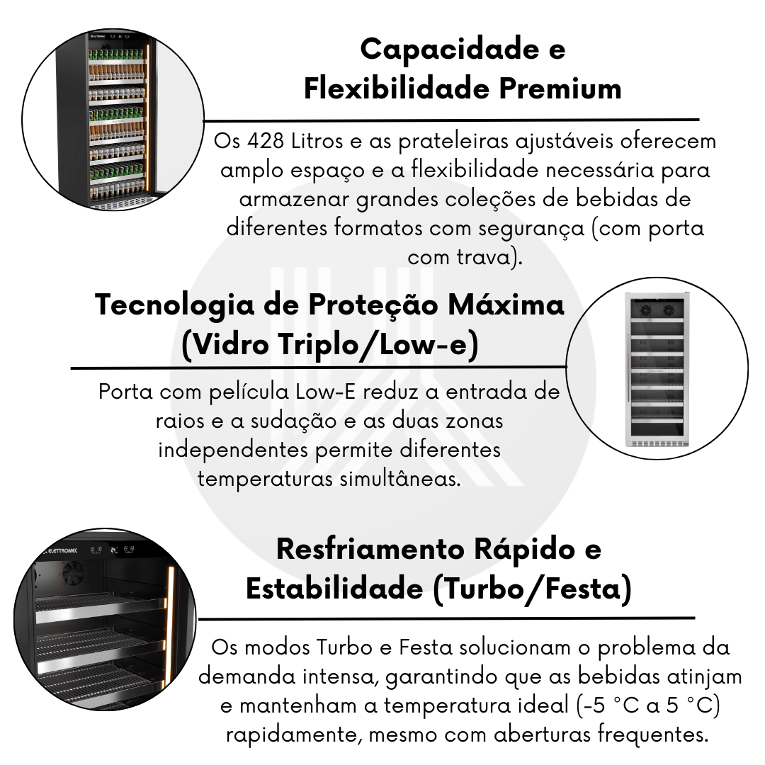 Capacidade e Flexibilidade Premium: Os 428 Litros e as prateleiras ajustáveis oferecem amplo espaço e a flexibilidade necessária para armazenar grandes coleções de bebidas de diferentes formatos com segurança (com porta com trava).