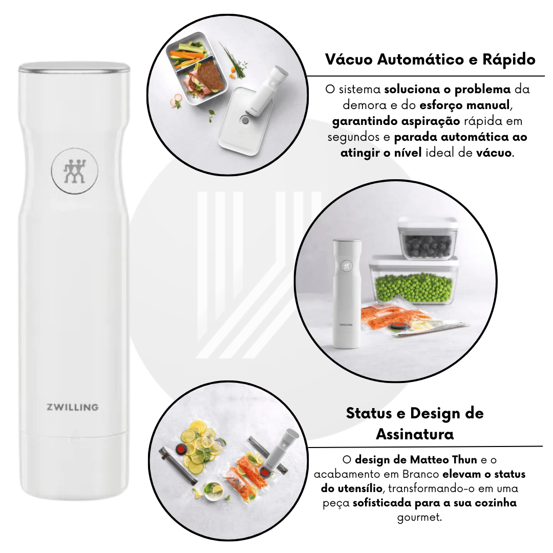 A Bomba de Vácuo ZWILLING FRESH & SAVE Branca é o acessório de alto padrão que traz a conservação de alimentos para a era da tecnologia e conveniência em sua cozinha gourmet. Com um design elegante e compacto assinado por Matteo Thun, esta bomba da ZWILLING é um investimento duradouro em praticidade e legado de excelência.