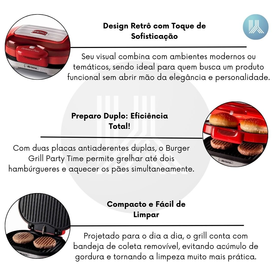 Prepare-se para uma verdadeira experiência gourmet em sua casa com o Burger Grill Elétrico Retrô Ariete Party Time. Compacto, potente e cheio de charme vintage, ele é o parceiro ideal para quem ama hambúrgueres saborosos, preparados com praticidade e estilo. Com design inspirado nas lanchonetes dos anos 50, o produto une desempenho, personalidade e um toque de nostalgia que transforma qualquer refeição em um momento especial.