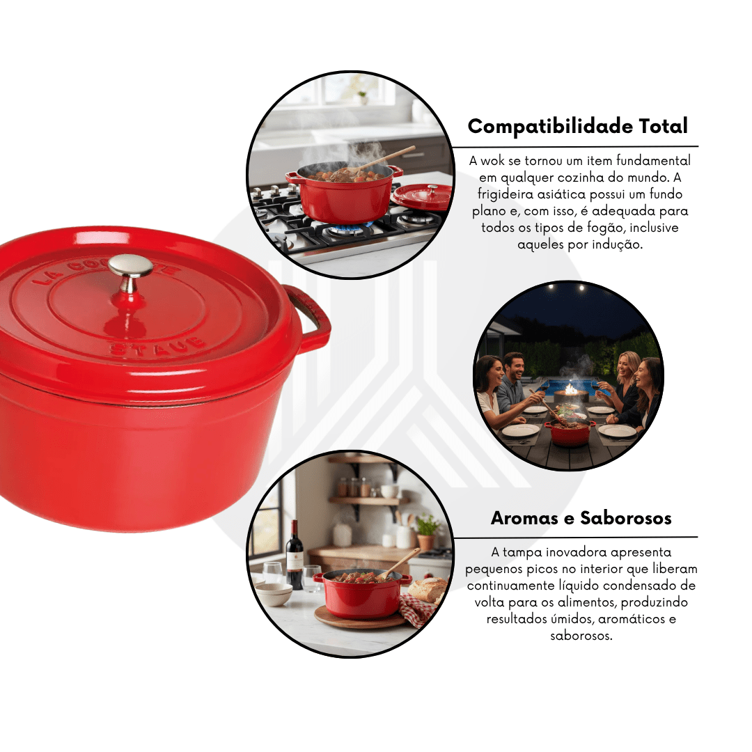 A Caçarola Redonda STAUB de 26 cm é o ícone do luxo culinário, a escolha dos melhores chefs do mundo para cozimentos lentos e ensopados perfeitos. Produzida na França em Ferro Fundido Esmaltado na vibrante cor Cereja, ela é uma peça de herança projetada para durar gerações e transitar com elegância da cozinha para a mesa. O ferro fundido possui qualidades excepcionais de retenção de calor, aquecendo-se uniformemente para criar aromas maravilhosos sem secar os alimentos.
