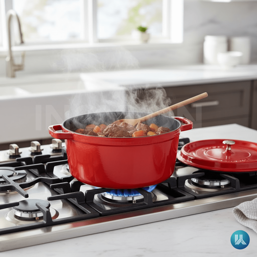 Performance Premium (Ferro Fundido): O ferro fundido premium resolve o problema de alimentos que esfriam rapidamente. Sua retenção de calor excepcional mantém sopas, guisados e risotos quentes por muito mais tempo na mesa.