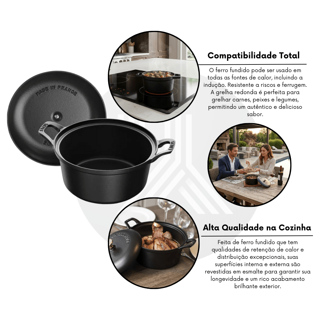 Apesar do tamanho reduzido, a performance é premium. O ferro fundido garante uma distribuição de calor uniforme e uma retenção térmica excepcional, mantendo a porção individual quente até a última colherada. A tampa possui o exclusivo sistema de autoirrigação (picos internos), que devolve a umidade aos alimentos, garantindo resultados suculentos. O interior conta com o esmalte preto fosco texturizado, altamente resistente e perfeito para dourar ingredientes. Compatível com todas as fontes de calor, incluindo indução, e segura para ir ao forno (com puxador resistente até 250°C), esta peça é um investimento em estilo e durabilidade.