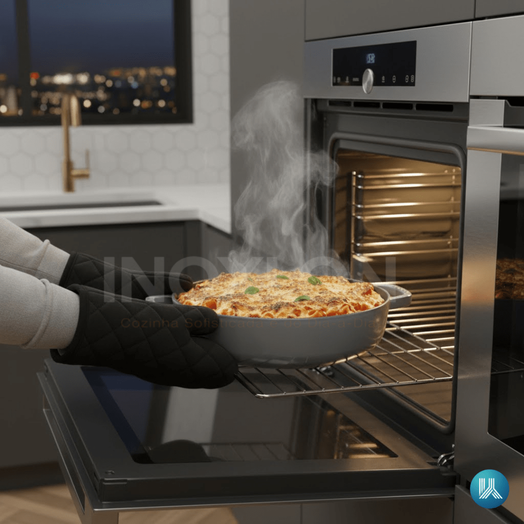 Estética "Do Forno à Mesa" (Cinza Grafite): O requintado acabamento em Cinza Grafite permite que a peça transite lindamente da cozinha para a mesa, garantindo que seus pratos sejam servidos com sofisticação.